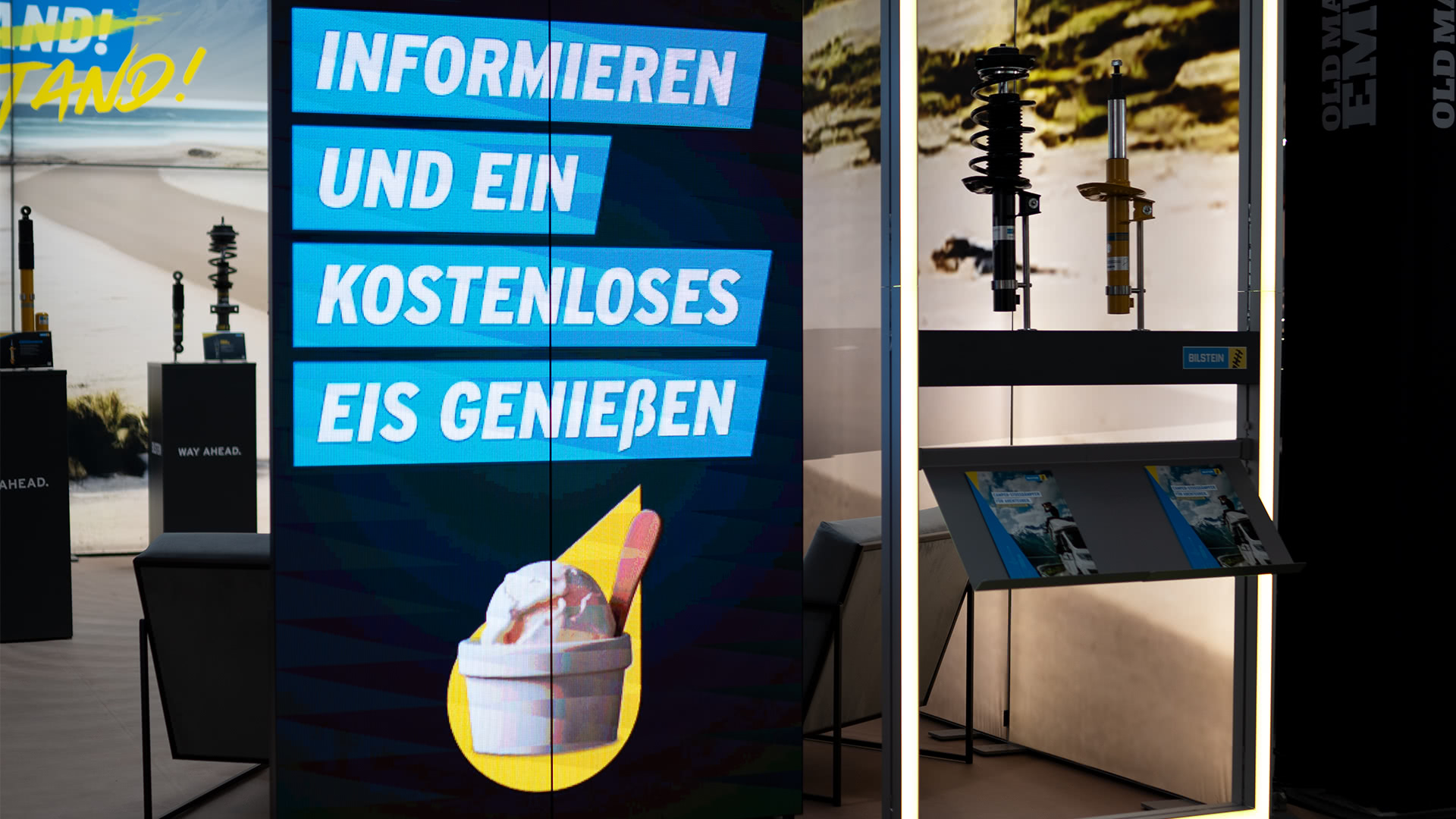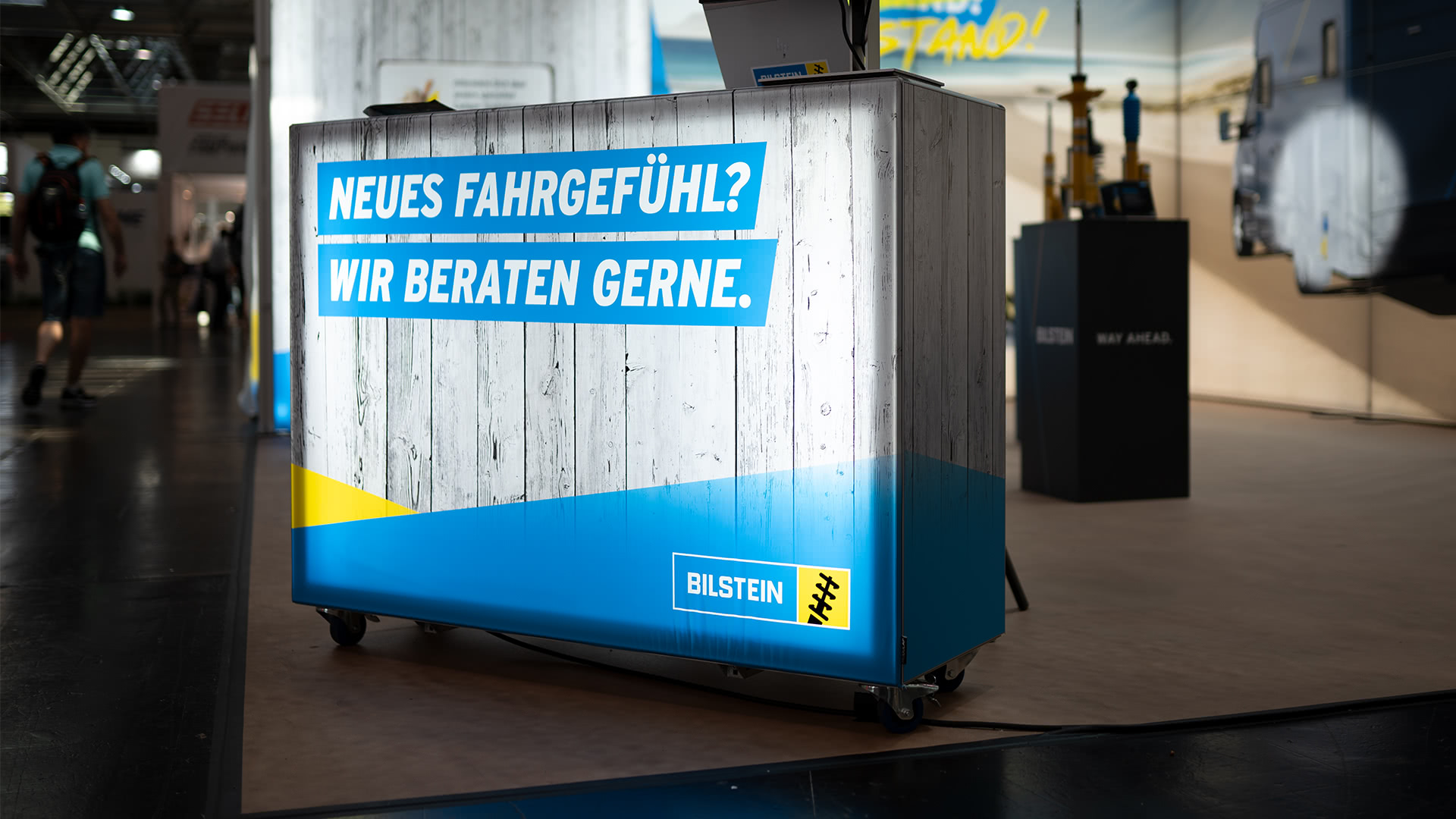 Die Stoßdämpfer und Fahrwerkslösungen von thyssenkrupp Bilstein wurden an strategisch platzierten Produktstationen präsentiert. Beleuchtete Displays und interaktive Präsentationen machten die Technologie greifbar und verständlich.