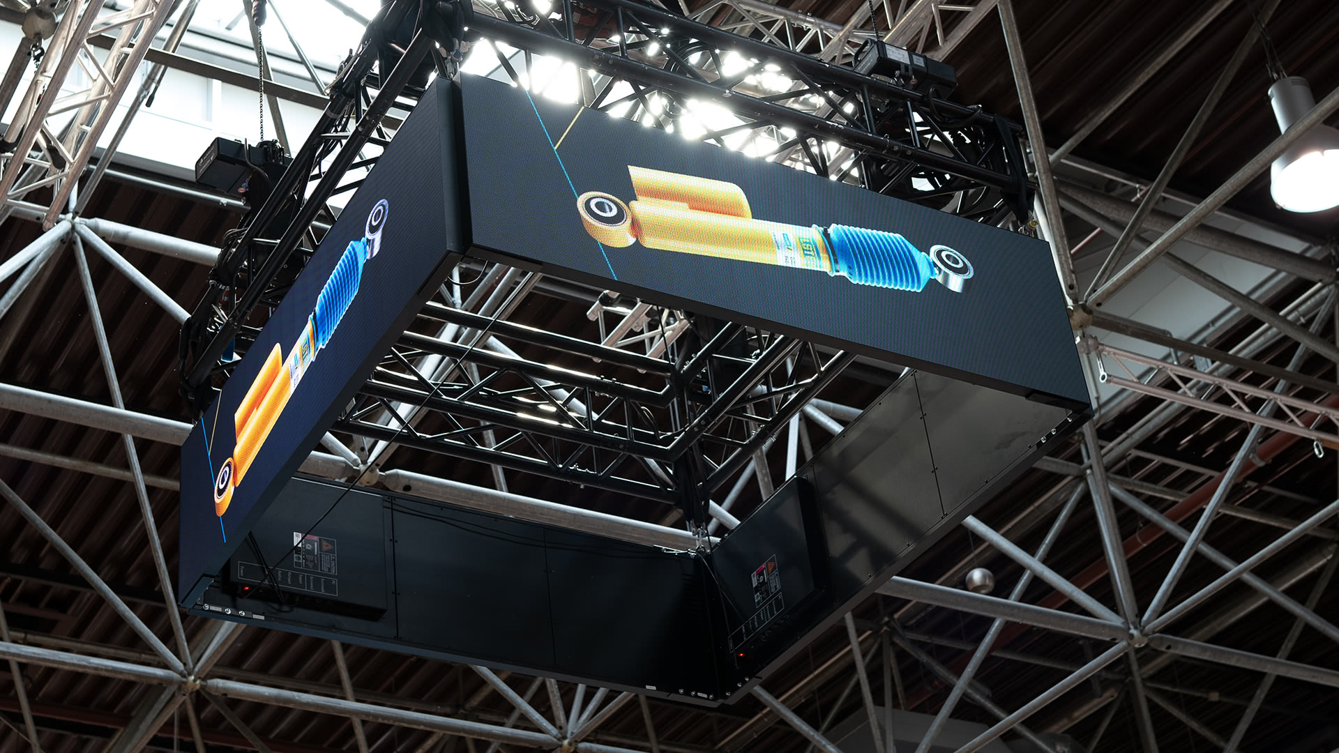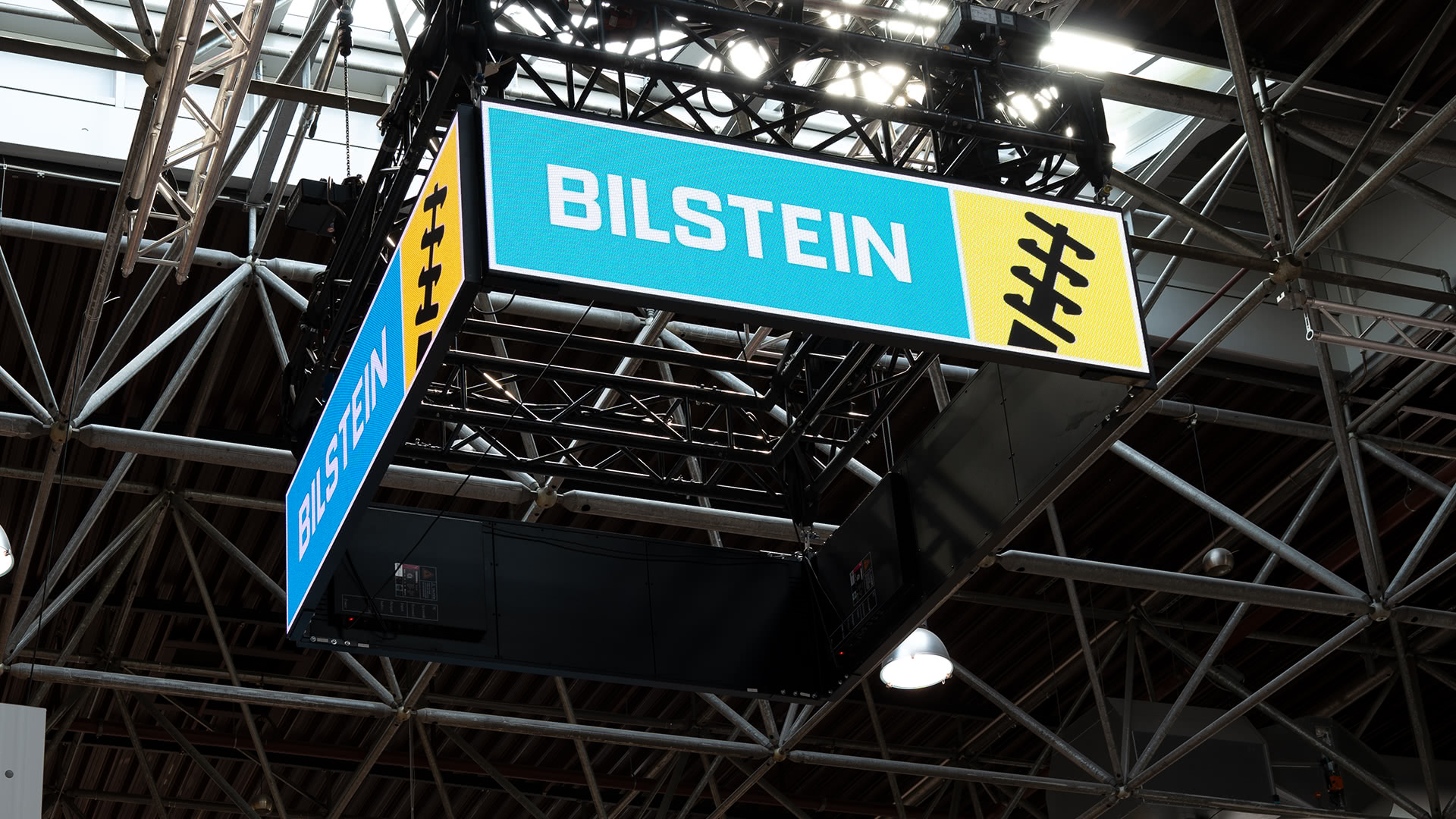 - 3. Videowall als Deckenhänger für maximale Wirkung Eine Videowall wurde als Deckenhänger installiert, um Besucher bereits aus der Ferne auf den Stand aufmerksam zu machen. Dynamische Inhalte und Produktvideos präsentierten die Innovationen von thyssenkrupp Bilstein in beeindruckender Größe und Brillanz.
