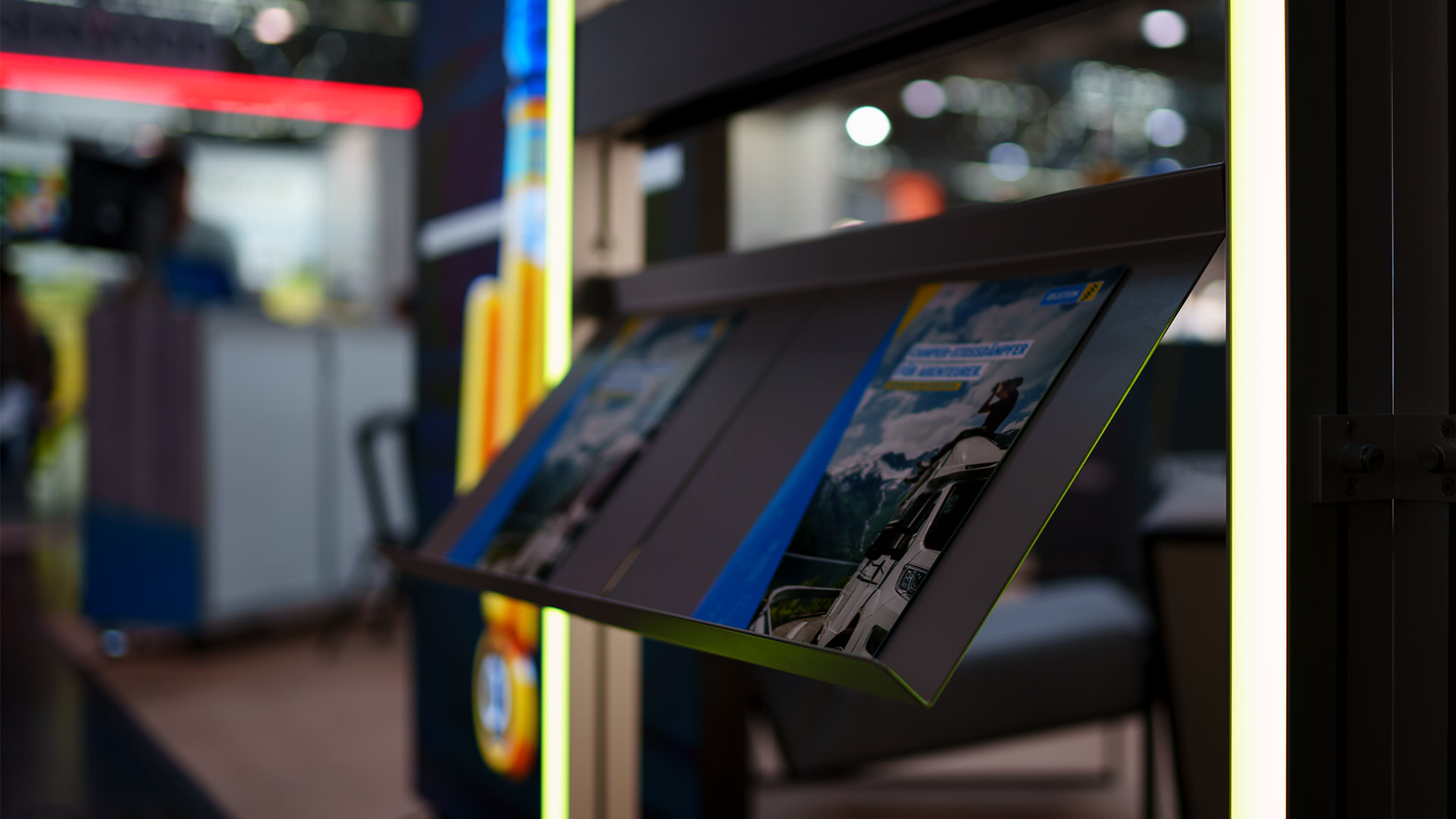 Integrierte LED-Leuchtkonturen sorgten für gezielte Akzente und lenkten die Aufmerksamkeit der Besucher auf die wichtigsten Produktbereiche. Die Beleuchtung machte den Stand schon von Weitem sichtbar und ließ ihn aus der Masse herausstechen.