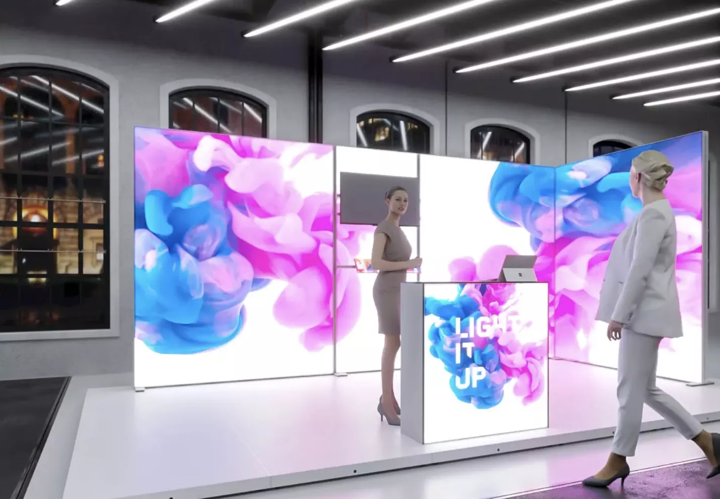 Hinterleuchtete Displays ergänzen dieses Konzept, weil sie selbst in dunklere Hallen professionell erscheinen und hochwertige Atmosphäre erzeugen. Werkzeuglose Aufbausysteme ermöglichen schnelle Montage und flexible Nutzung als Raumtrenner, wodurch du Beratungs-, Präsentations- oder Loungebereiche klar strukturieren kannst.