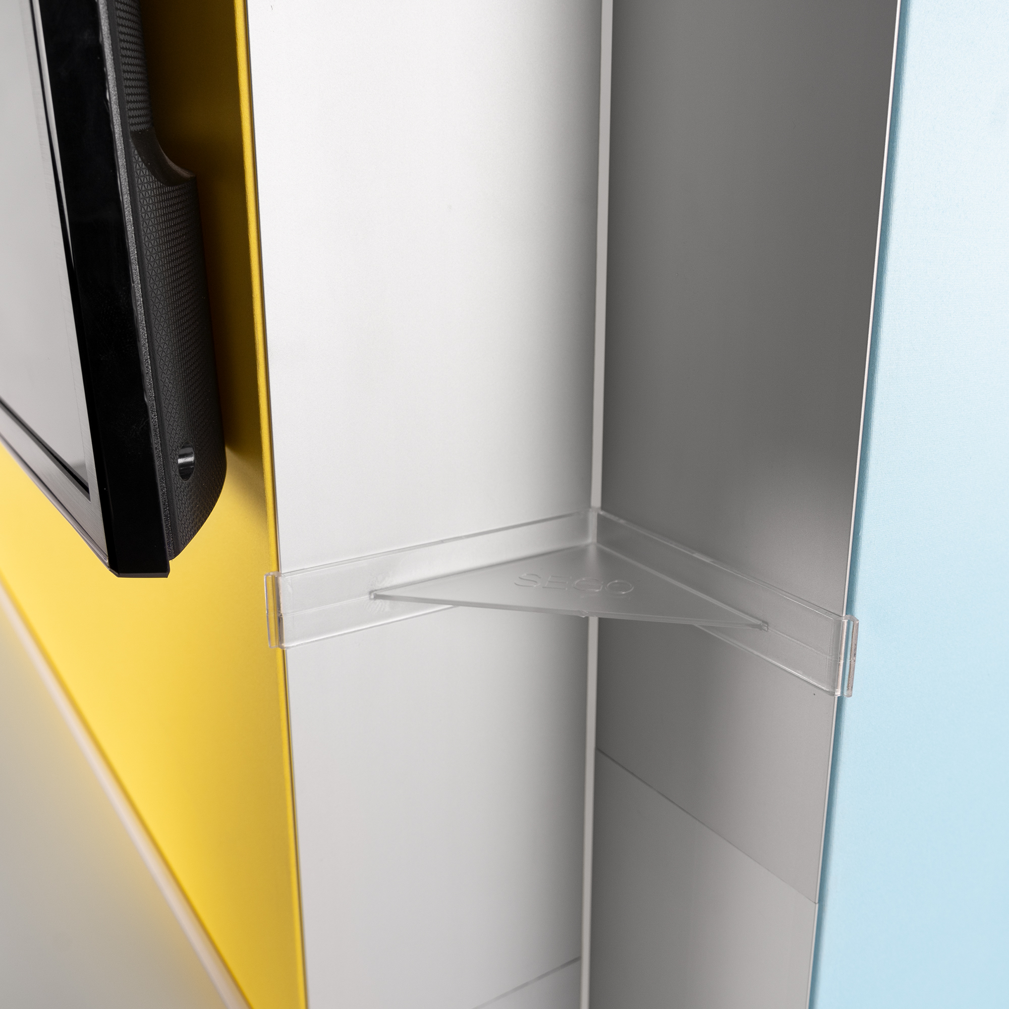 • Für eine einfache Eckerbindung Ihrer Sego Messewände