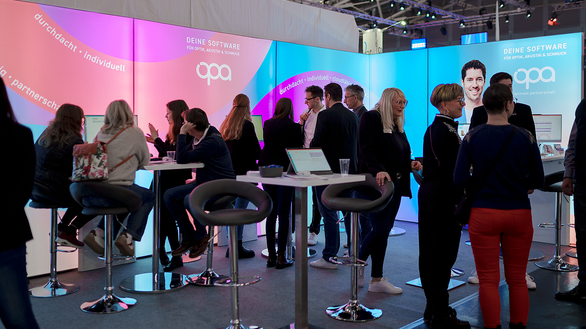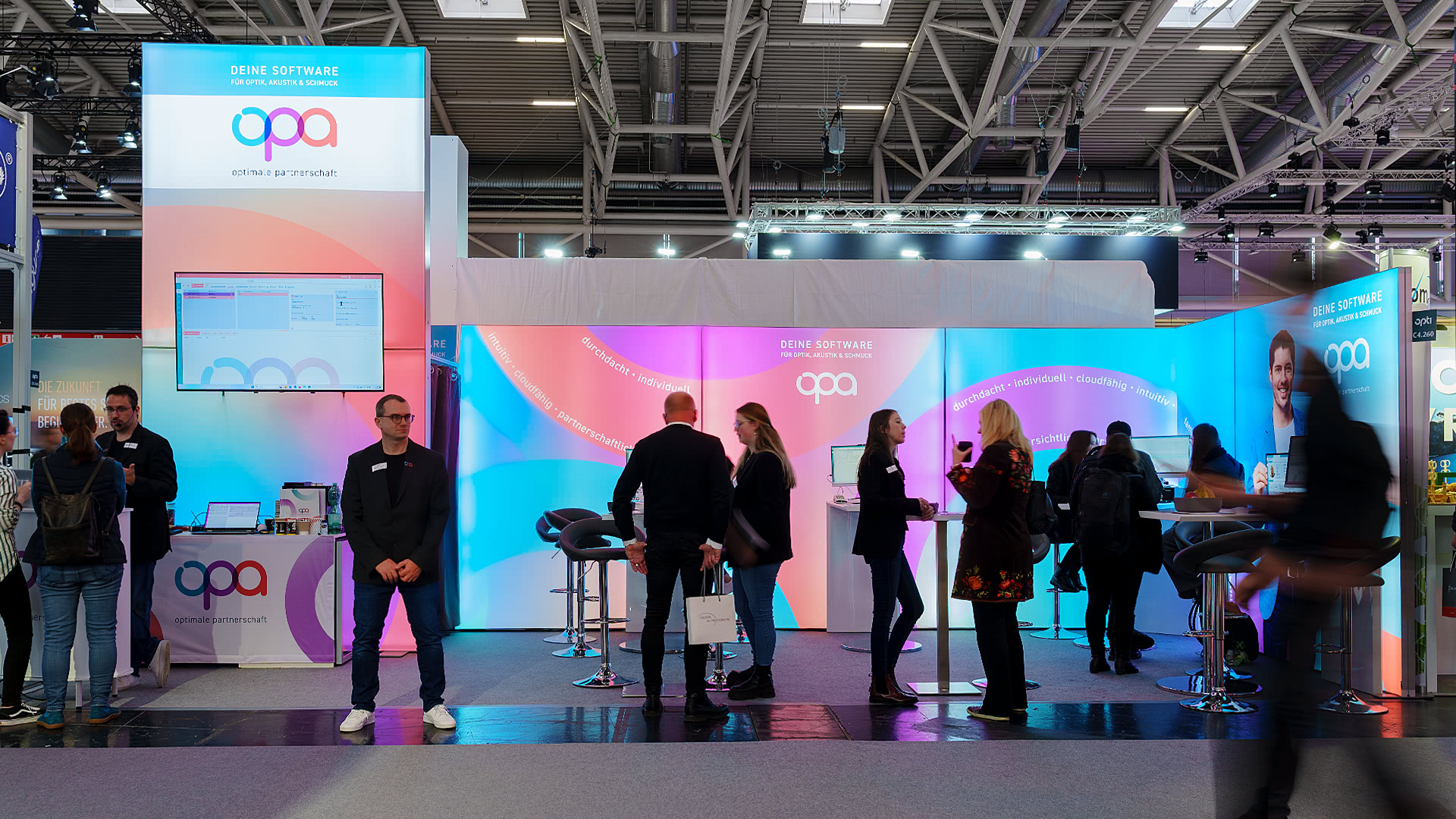In enger Zusammenarbeit mit der EDV-Optik-Partner GmbH entstand ein modularer LED-Messestand, der durch klare Gestaltung und funktionale Details überzeugte. Das offene Standkonzept schuf eine einladende Atmosphäre, während hinterleuchtete Messewände für hohe Sichtbarkeit sorgten. Über einen großformatigen Bildschirm, integriert im zentralen Turmelement, konnten sich Besucher direkt vor Ort einen praxisnahen Eindruck von der OPA3-Software verschaffen.