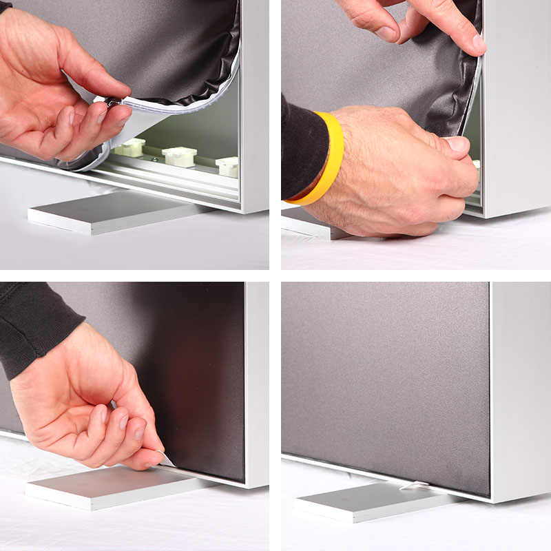 - Rahmenlose Optik & einfacher Grafikwechsel durch Gummikeder-System