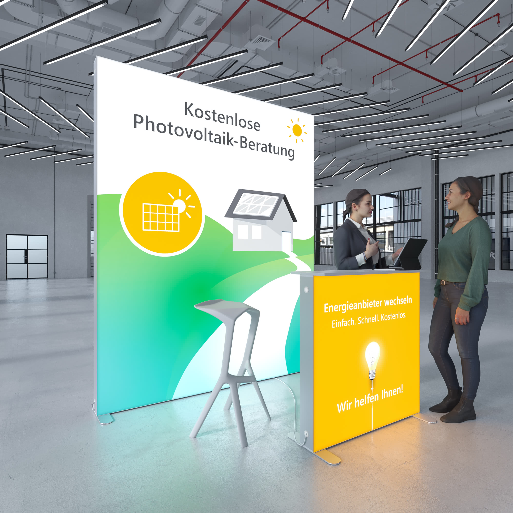 Die Sego Messestände bieten eine kostengünstige Alternative zum Individualbau. Optimal für Einsteiger und perfekt für Messe Promotion und Event. Sie bekommen zu einem günstigen Preis alles, was Sie von einem professionellen Leuchtmessestand erwarten können: Eine leistungsstarke Beleuchtung, brillante Drucke und ein einfaches Handling durch einen komplett werkzeugfreien Aufbau. Der Transport ist ebenfalls sehr einfach: Jede Leuchtwand lässt sich in nur einer Tasche verstauen.