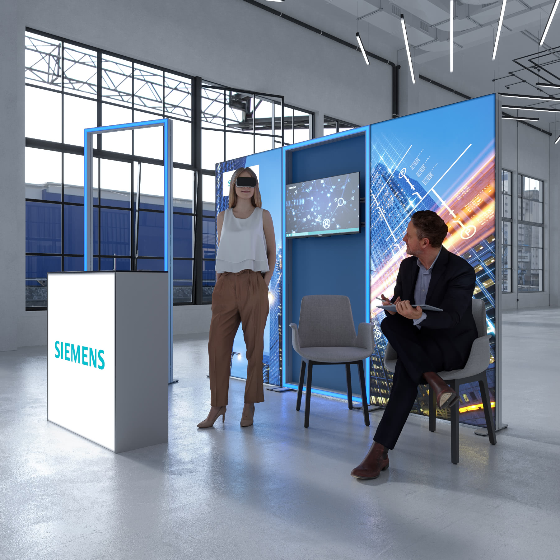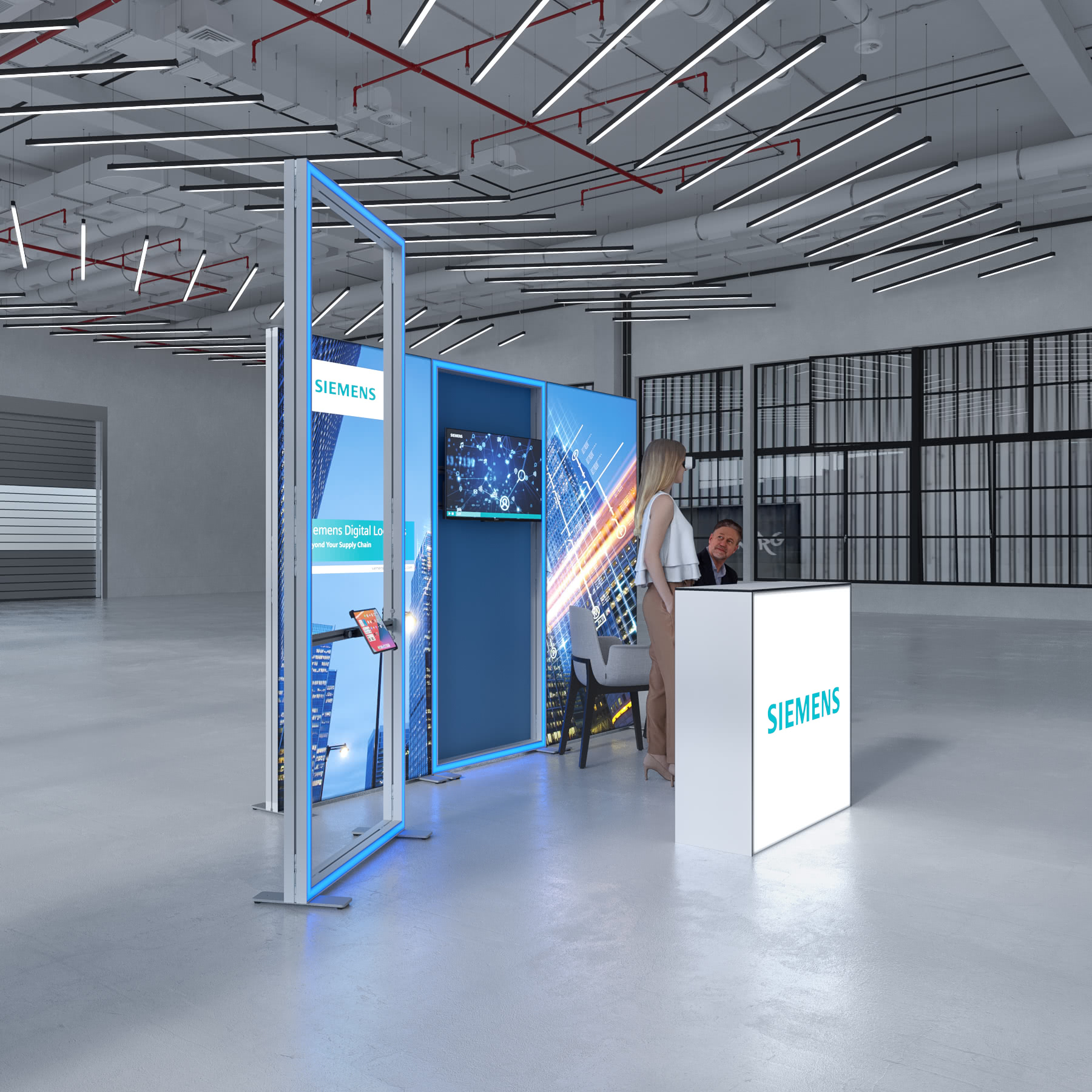 Beleuchteter Messestand, bestehend aus zwei LED Wänden und zwei Leuchtkonturen (Farbe nach Wahlmittels RGB) inkl. Druck