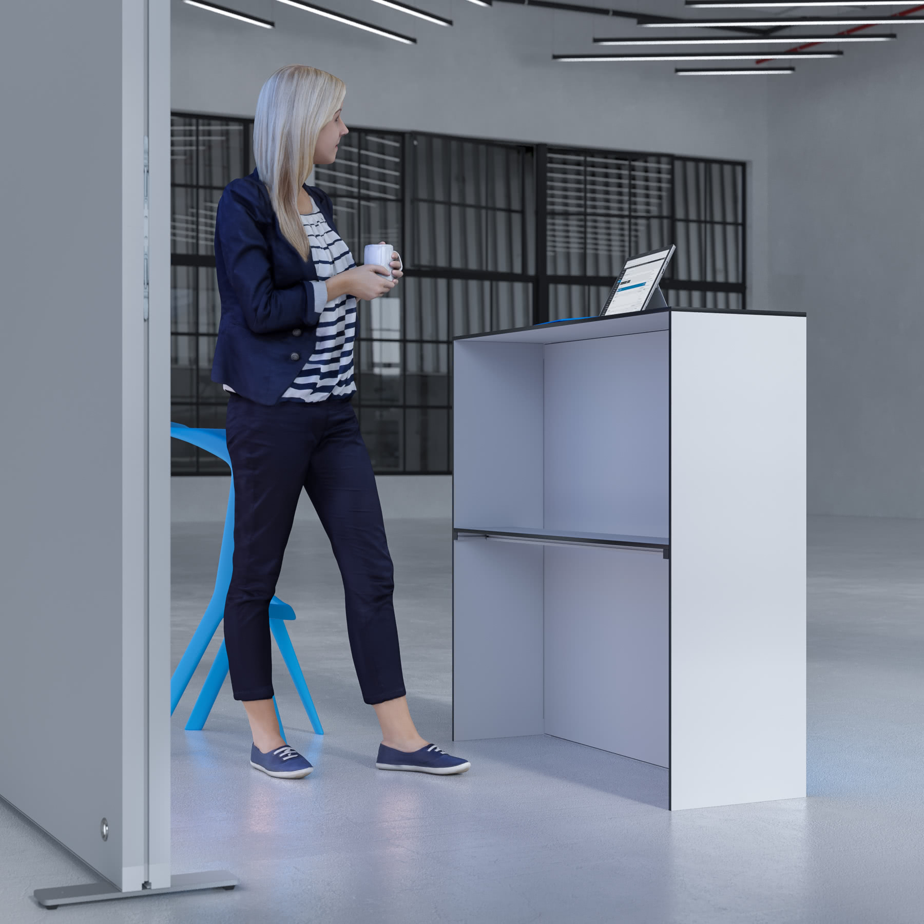 Wir empfehlen für den Messestand Dora drei Transporttrolleys (B 130 x H 25 x T 40cm), diese finden Sie unter Zubehör.