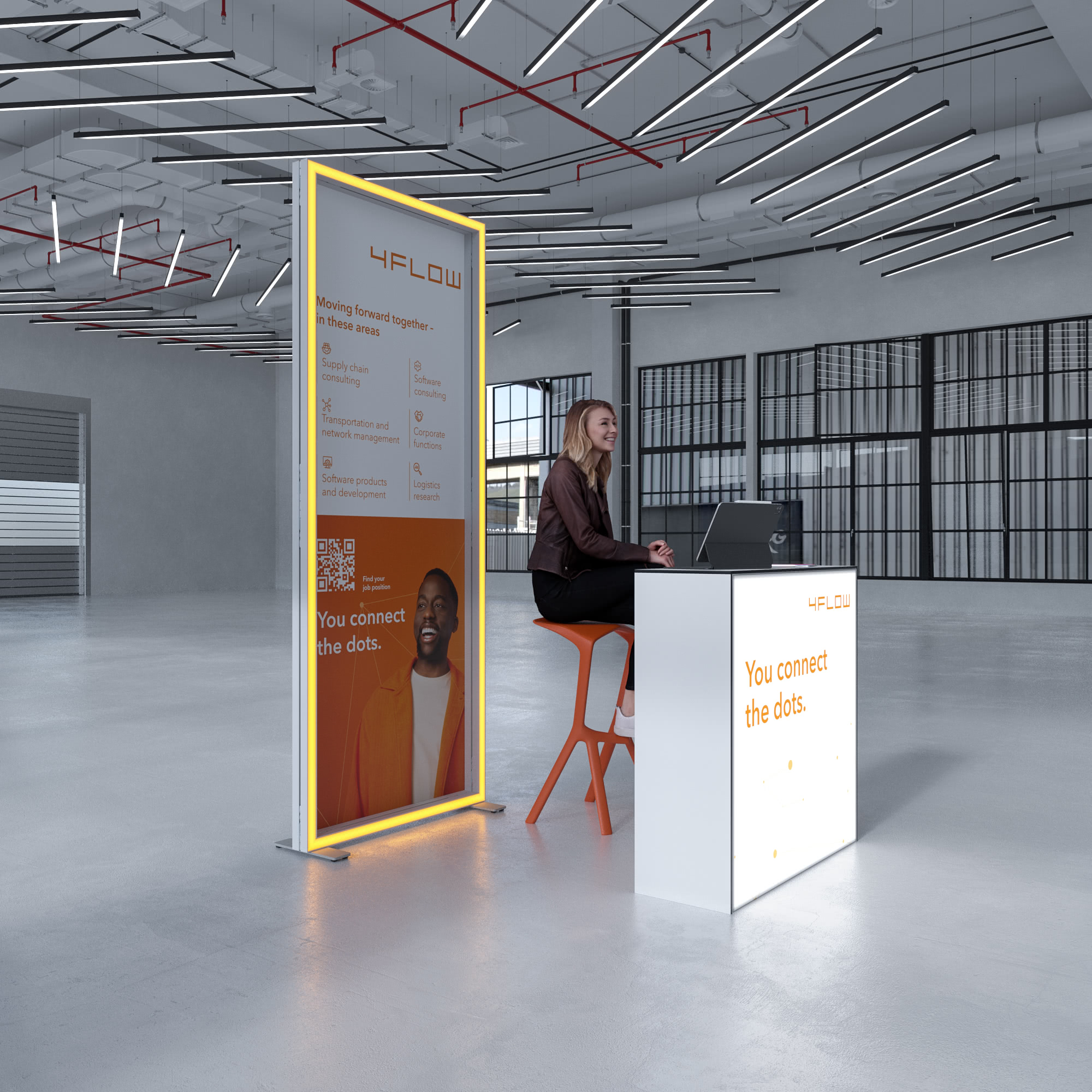 Die LED Messestände ONE bieten eine kostengünstige Alternative zum Individualbau. Optimal für Einsteiger und perfekt für Messe Promotion und Event. Sie bekommen zu einem günstigen Preis alles, was Sie von einem professionellen Leuchtmessestand erwarten können: Eine leistungsstarke Beleuchtung, brillante Drucke und ein einfaches Handling durch einen komplett werkzeugfreien Aufbau. Der Transport ist ebenfalls sehr einfach: Jede Leuchtwand, Leuchtkontur oder Leuchttheke lässt sich in nur einer Tasche verstauen.