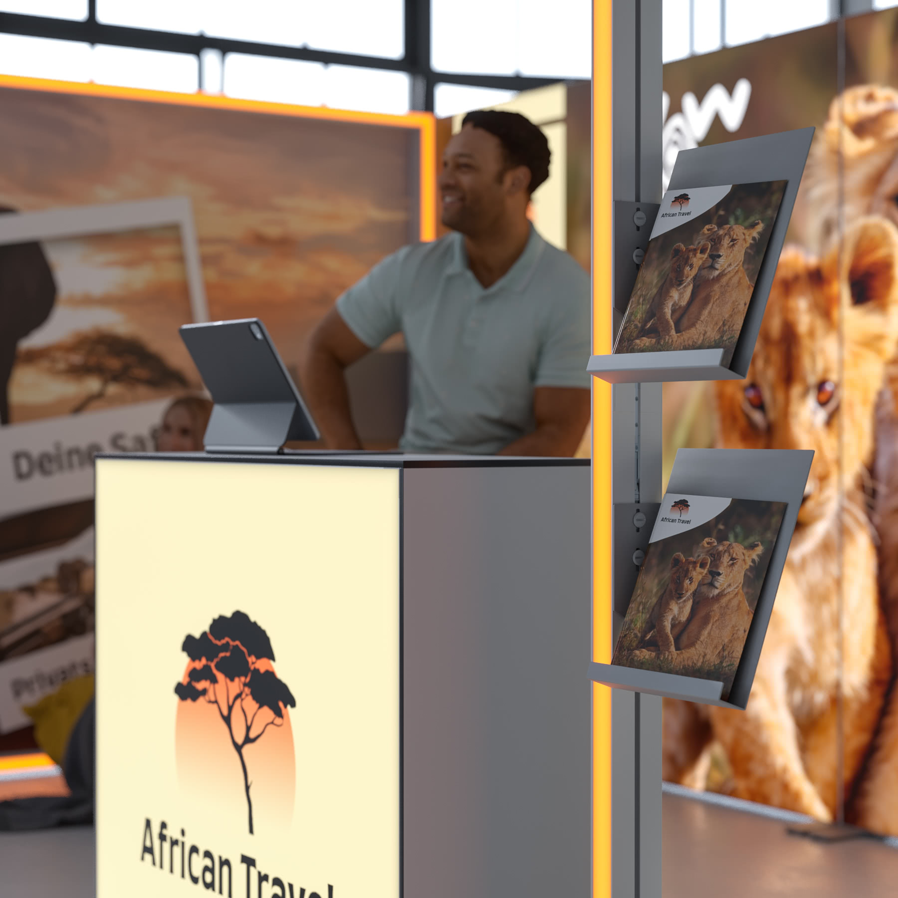 Wir empfehlen für den Messestand Set Zuri 6 Transporttrolleys (B 130 x H 25 x T 40cm), diese finden Sie unter Zubehör.