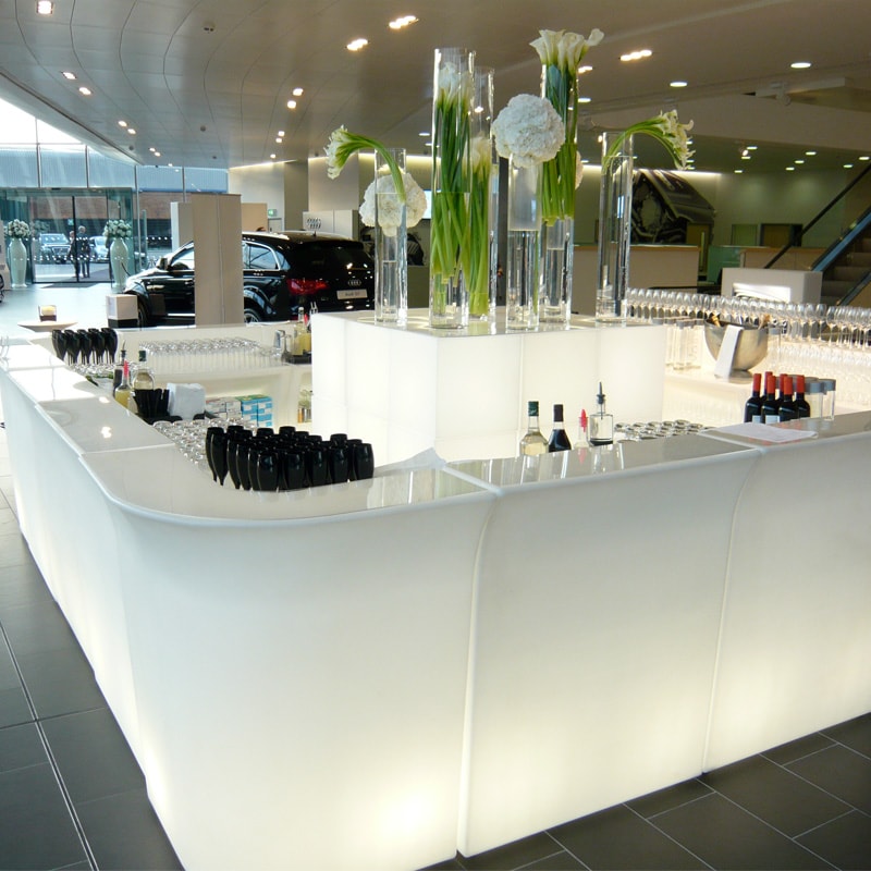 Modernes, beleuchtetes Bar-Eckelement aus weiß-transluzentem Polyethylen