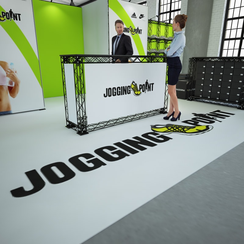 - Optik & Design: Der Boden muss zum Konzept deines Messestandes passen und unterstützt die visuelle Markenbotschaft.