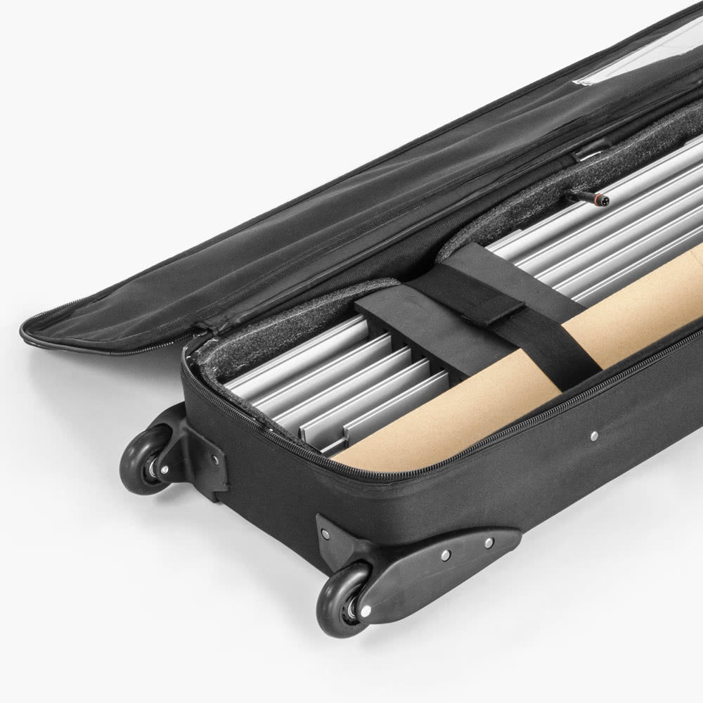 Optimal für Einsteiger und perfekt für Messe, Promotion und Event. Die Messewand LED Budget bietet eine LED Beleuchtung, brillante Drucke und ein einfaches Handling durch einen komplett werkzeugfreien Aufbau. Die Logistik ist genauso einfach: Das leichte System lässt sich handlich zusammenlegen und von nur einer Person transportieren. Die Messewand to go!