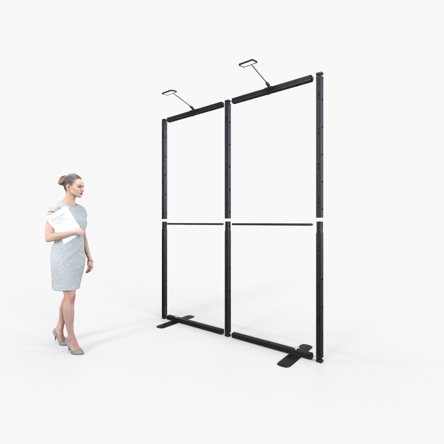 Das Moduframe bietet maximale Flexibilität: Das einfache, modulare Baukastensystem sorgt für vielfältige Aufbaumöglichkeiten, das einfache Stecksystem garantiert einen komfortablen und komplett werkzeugfreien Auf- und Abbau Ihres Messestandes. Der modulare Aufbau ist vielfältig einsetzbar, so dass jeder Aussteller bei nachfolgenden Veranstaltungen die Grafik und Form schnell ändern kann. Dadurch haben Sie die Möglichkeit, die Form und Höhe des Standes zu verändern und den Raum, den Sie haben, voll zu nutzen. Das Moduframe Messesystem besteht aus einem Kern aus Aluminium, der für eine optimale Stabilität bei einem sehr leichten Gewicht sorgt. Die Module des Moduframe Messestandsystems lassen sich flexibel kombinieren, neu zusammenbauen oder umgestalten. Nach Ihrer Messe oder Ihrem Event können Sie die einzelnen Standmodule einfach wieder auseinanderbauen und in den praktischen Transporttaschen verstauen. Die Breite der Grafiken innerhalb einer Wand können unterschiedliche Maße haben, z.B. kann eine 500 cm breite Wand auch aus 5 einzelnen 100 cm breiten Grafiken bestehen oder einer 300 cm breiten und einer 200 cm breiten Grafik bestehen.
