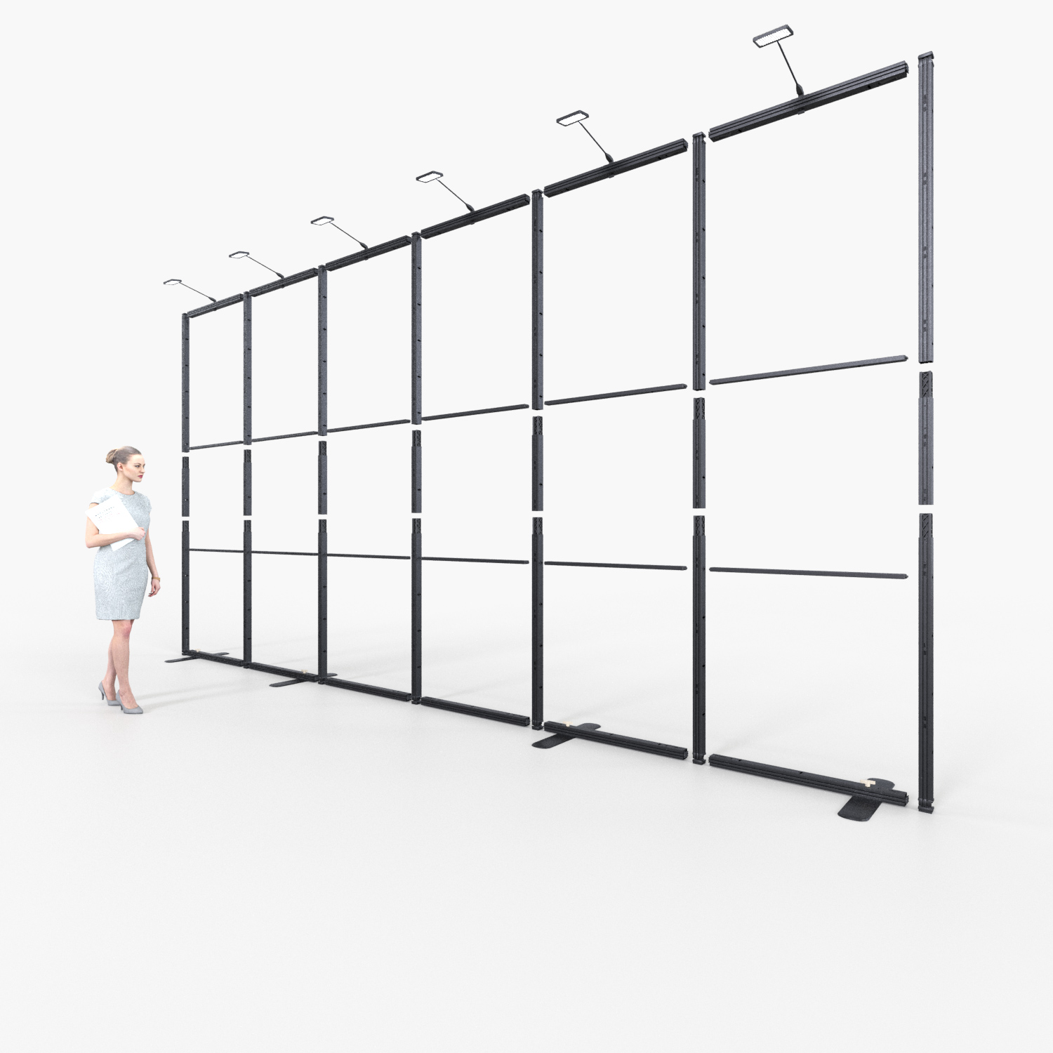 Das Moduframe bietet maximale Flexibilität: Das einfache, modulare Baukastensystem sorgt für vielfältige Aufbaumöglichkeiten, das einfache Stecksystem garantiert einen komfortablen und komplett werkzeugfreien Auf- und Abbau Ihres Messestandes. Der modulare Aufbau ist vielfältig einsetzbar, so dass jeder Aussteller bei nachfolgenden Veranstaltungen die Grafik und Form schnell ändern kann. Dadurch haben Sie die Möglichkeit, die Form und Höhe des Standes zu verändern und den Raum, den Sie haben, voll zu nutzen. Das Moduframe Messesystem besteht aus einem Kern aus Aluminium, der für eine optimale Stabilität bei einem sehr leichten Gewicht sorgt. Die Module des Moduframe Messestandsystems lassen sich flexibel kombinieren, neu zusammenbauen oder umgestalten. Nach Ihrer Messe oder Ihrem Event können Sie die einzelnen Standmodule einfach wieder auseinanderbauen und in den praktischen Transporttaschen verstauen. Die Breite der Grafiken innerhalb einer Wand können unterschiedliche Maße haben, z.B. kann eine 500 cm breite Wand auch aus 5 einzelnen 100 cm breiten Grafiken bestehen oder einer 300 cm breiten und einer 200 cm breiten Grafik bestehen.