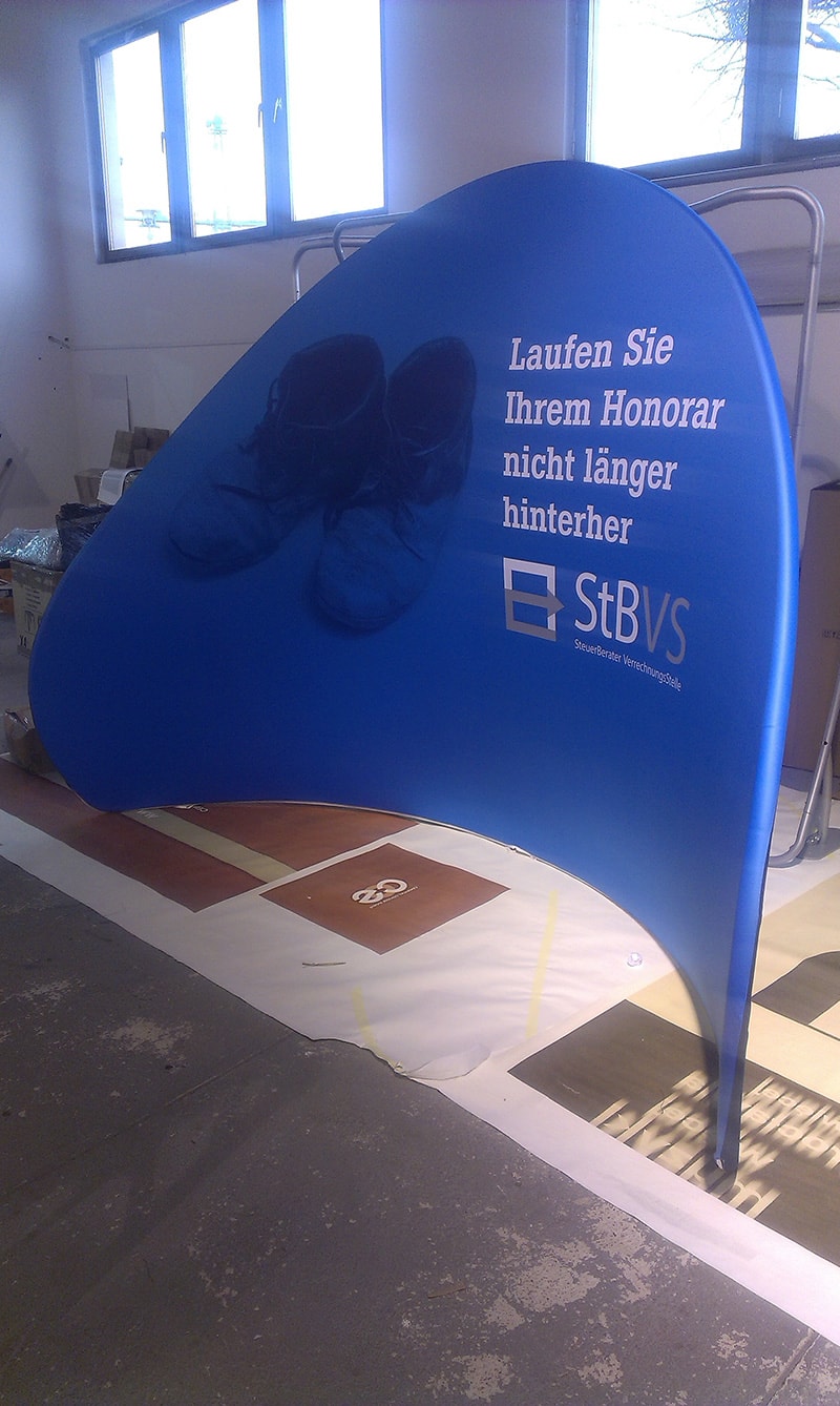 Die ExpoVario Wand besteht aus dem Gestänge, dem bedruckten Spezialstoff sowie einer hochwertigen, gepolsterten Transporttasche.