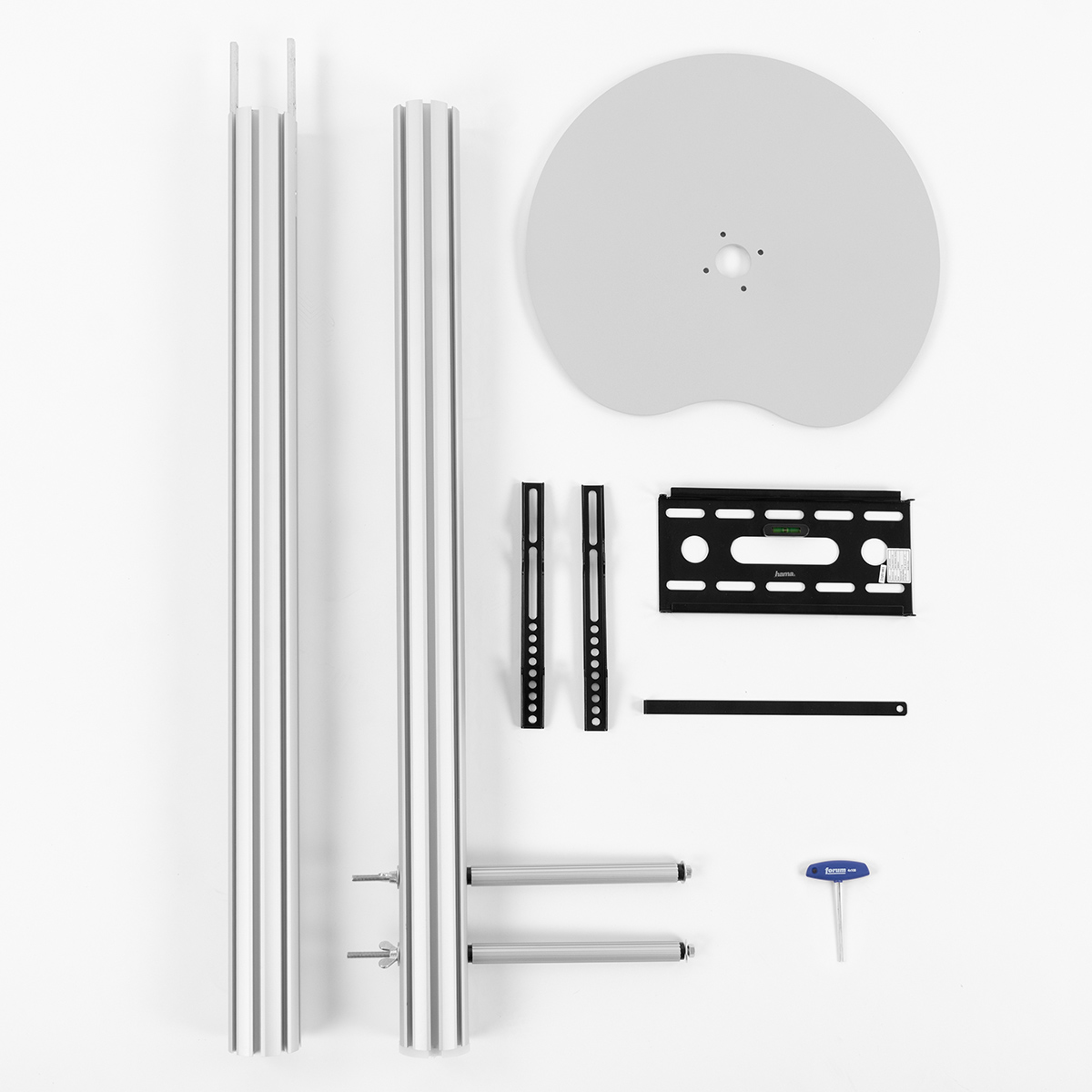 Der Galgen besteht aus dem Ständer, einer Bodenplatte und Befestigungsmaterial.