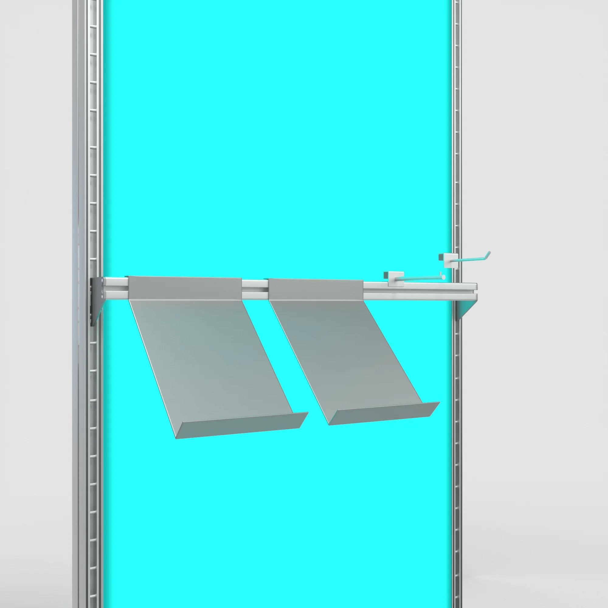 Das funktionale Zubehör für die modulare Architektur des LED One Messesystems lässt sich ganz einfach mit Messewänden kombinieren. Die Basis für die Anbringung vieler Zubehör-Elemente sind vertikal montierte Schlitzschienen. An die Multischiene lassen sich Prospekthalter, Ipad-Halter , Front – Haken, Abhänger oder Arme anbringen.