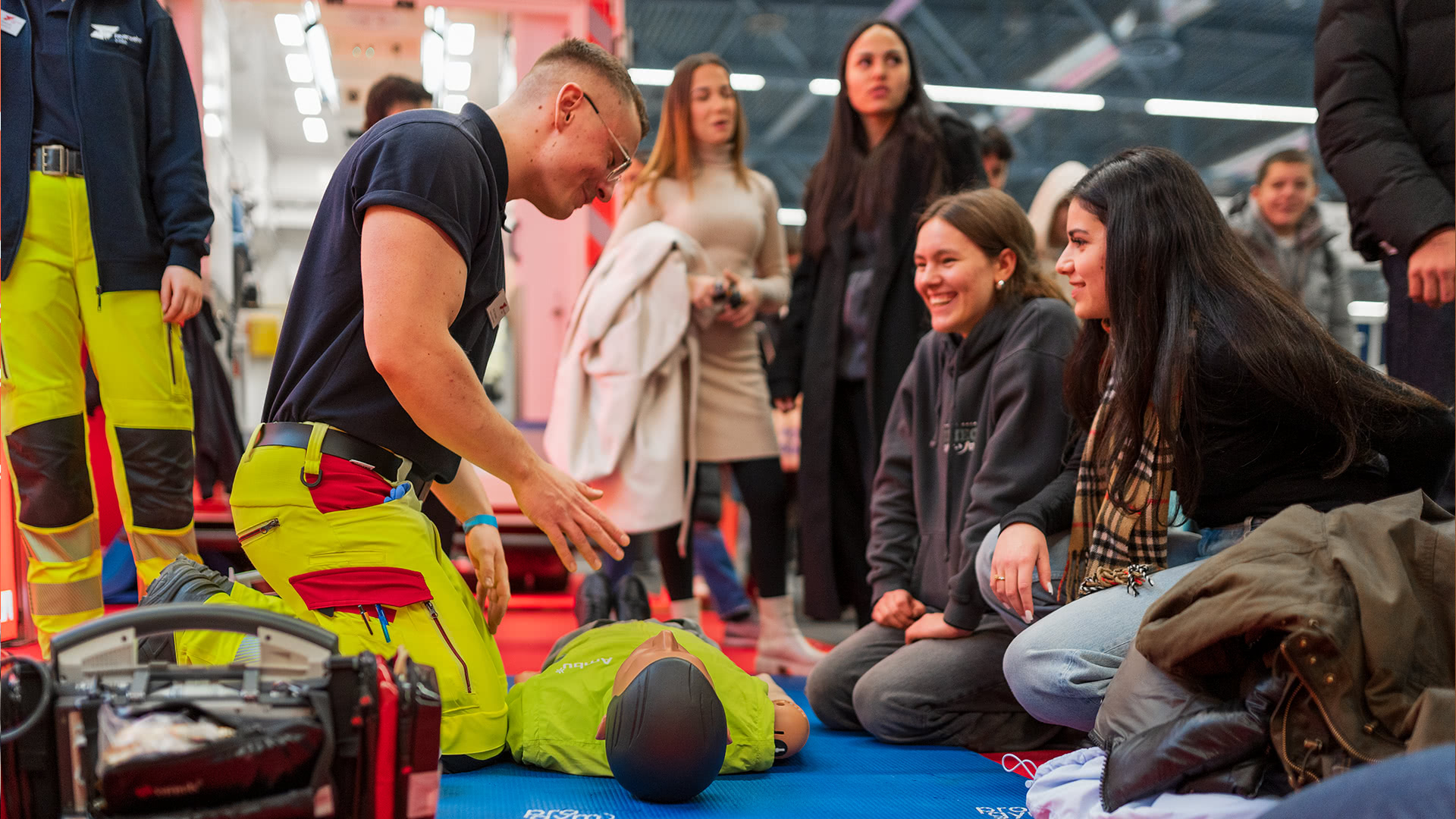 Ein weiteres Highlight war der Bereich zur Ersten Hilfe, in dem Besucher:innen an einer Reanimationspuppe üben konnten, wie man lebensrettende Maßnahmen wie Herzdruckmassage und Beatmung richtig durchführt – praxisnah und eindrucksvoll vermittelt durch das Team der Feuerwehr. Mit leuchtstarken Wandelementen, integrierten Funktionsbereichen und einer klaren Standarchitektur bot der Aufbau den passenden Rahmen für einen Messeauftritt, der Aktion, Dialog und nachhaltige Eindrücke miteinander verbindet.
