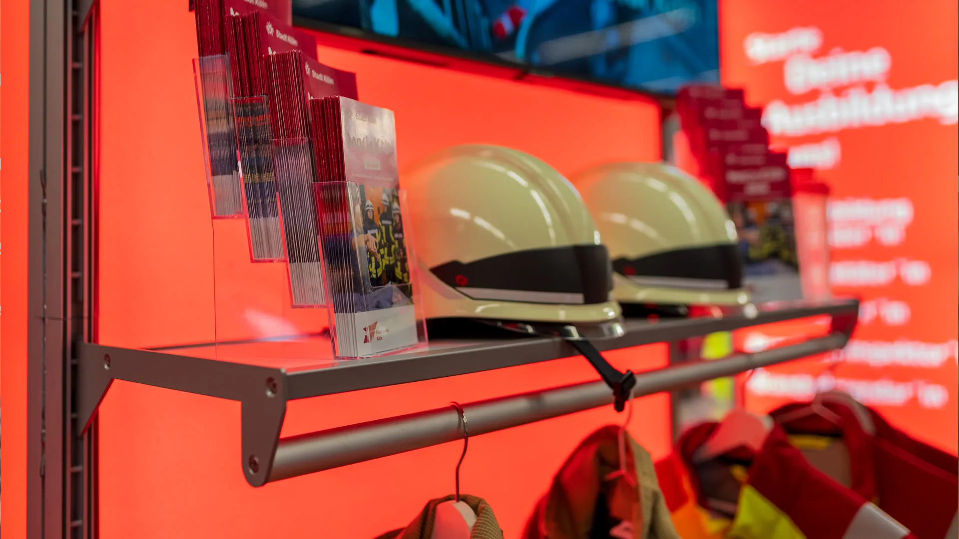 Für die Feuerwehr Köln realisierten wir einen Messestand, der nicht nur informiert, sondern echtes Erleben möglich macht. Das offene, modulare Standdesign bot ausreichend Platz für interaktive Stationen, die von der Feuerwehr inhaltlich selbst konzipiert und betreut wurden. So konnten sich Besucher:innen unter fachlicher Anleitung von einer Feuerwehrleiter abseilen, in eine vollständige Feuerwehr-Schutzmontur schlüpfen und ein Erinnerungsfoto machen – ein beliebter Moment und idealer Gesprächsanlass.