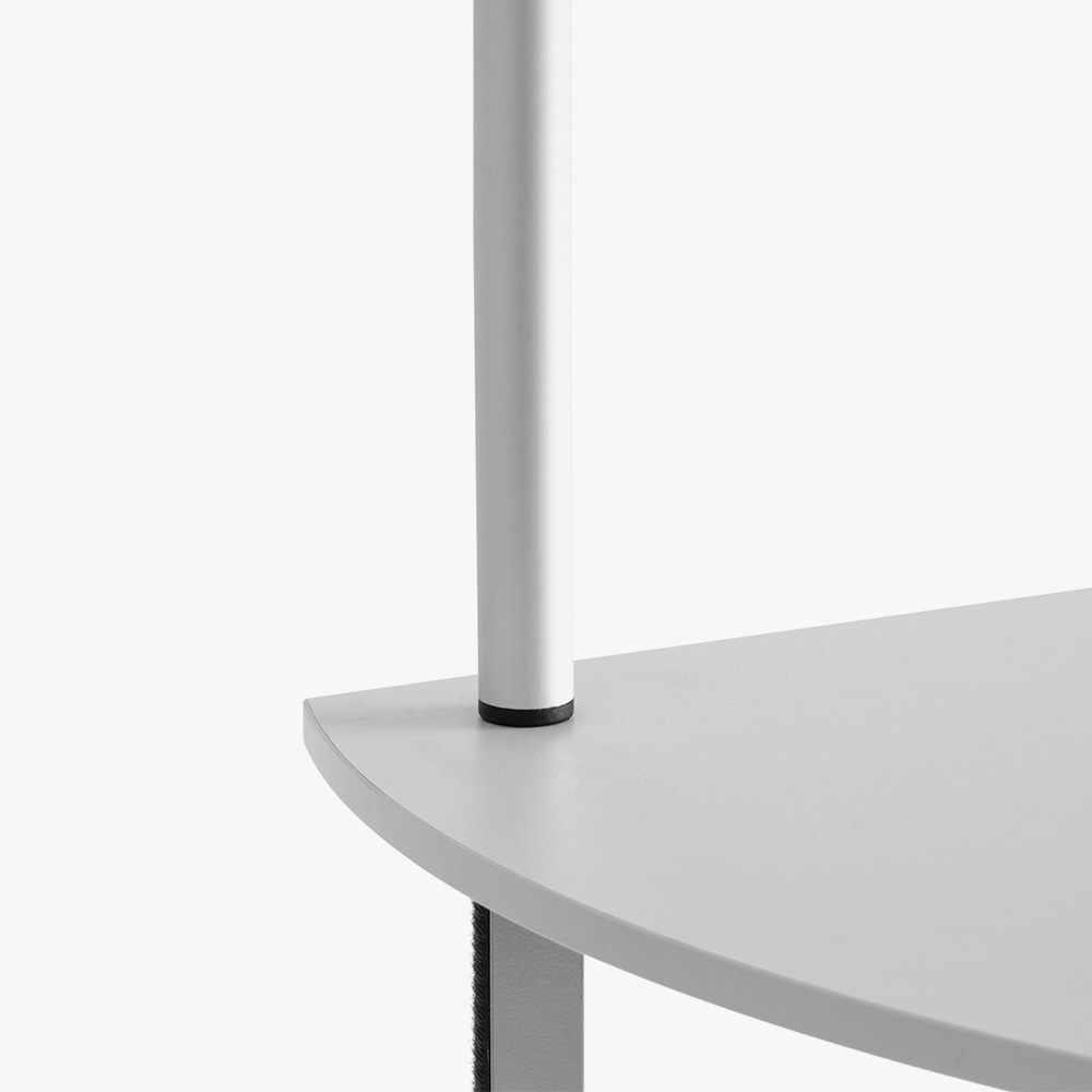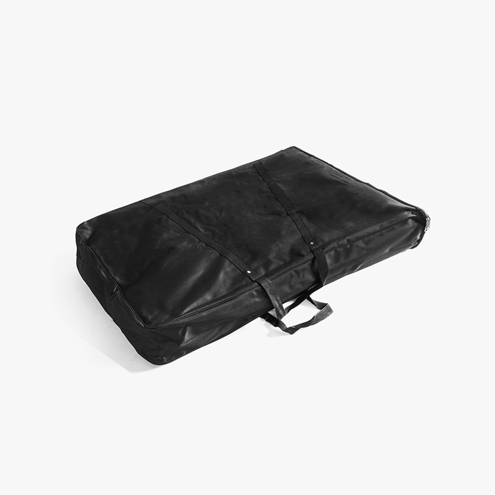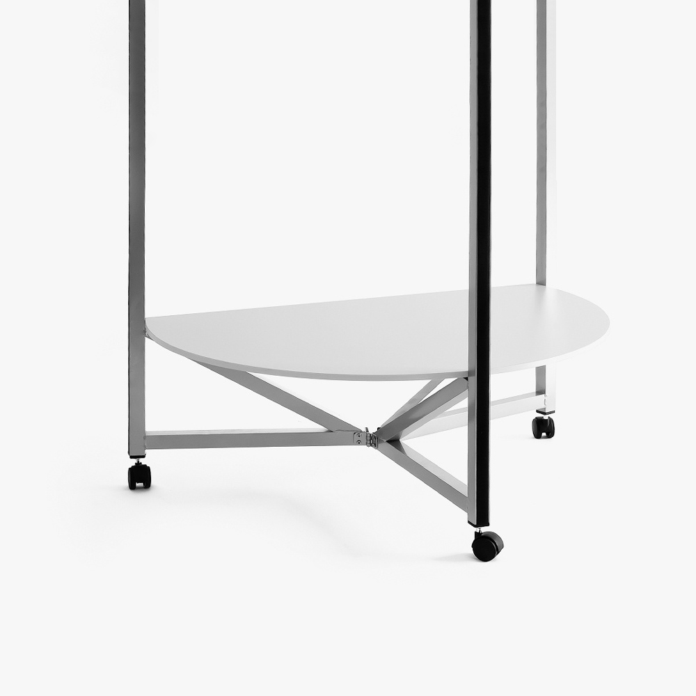 Die Falttheke besteht aus dem System inkl. Füßen (Rollen), einem Topschild, der bedruckten Grafik sowie einer Deckelplatte (grau). Im Lieferumfang ist ebenfalls ein Zwischenboden und eine gepolsterte Transporttasche enthalten.