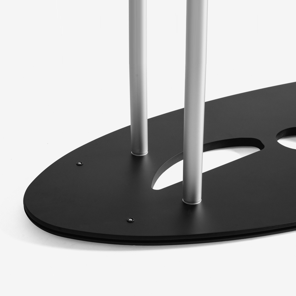 Die Theke besteht aus dem Aluminiumkorpus, einer Deckelplatte und einer Textilgrafik. Im Lieferumfang ist ebenfalls eine Transporttasche enthalten. Die Montage und Demontage ist extrem schnell, einfach und erfordert kein zusätzliches Werkzeug.
