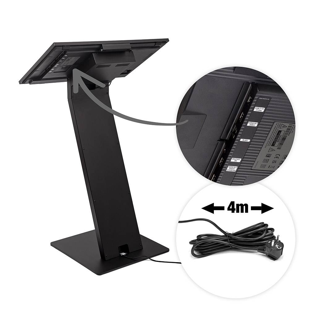 Die Zukunft der Werbetheken Stellen Sie Besuchern, Gästen und Kunden alle benötigten Informationen auf einem interaktiven und hochentwickelten digitalen Kiosk zur Verfügung. Zeigen Sie den Grundriss von Einkaufszentren, Ferienanlagen oder Themenparks. Oder spielen Sie ein interaktives Video in einem Museum oder Zoo ab. Die Basis aus 6 mm starkem Stahlblech ist mit 7,5 mm dicken Gummifüßen ausgestattet, die für eine gute Stabilität und ein elegantes Design sorgen. Der Kiosk ist mit 32" Bildschirm erhältlich. Das Gehäuse ist standardmäßig in schwarz.