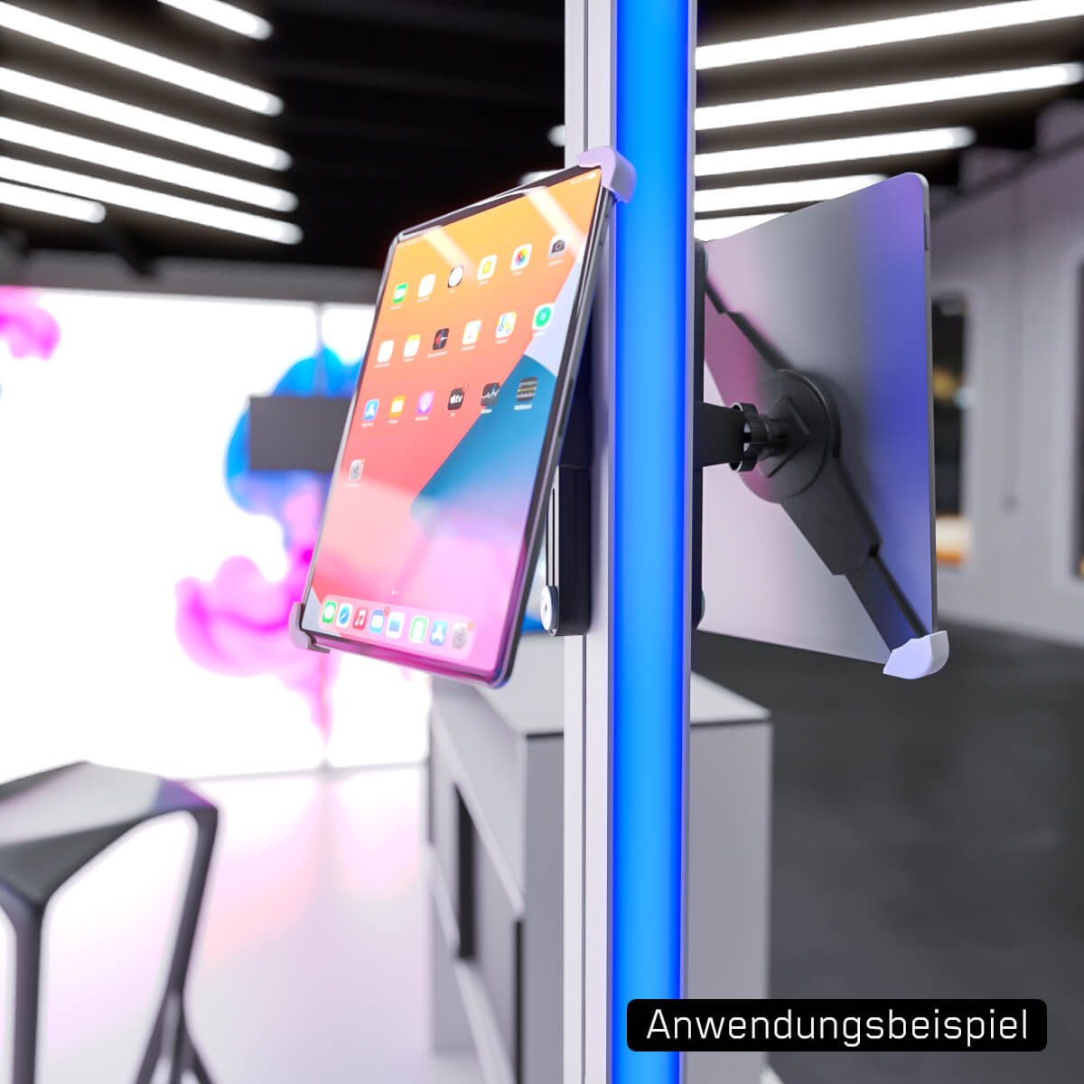 Das funktionale Zubehör für die modulare Architektur des LED One Messesystems lässt sich ganz einfach mit Messewänden kombinieren. Die Basis für die Anbringung des Prospekthalters sind vertikal montierte Schlitzschienen, sowie eine horizontale Multischiene. Für die Anbringung an einem Lightframe reicht eine Multischiene als Basis aus. Die Halterung ist passend für Tablets mit einer Gerätediagonale bis 32 cm.