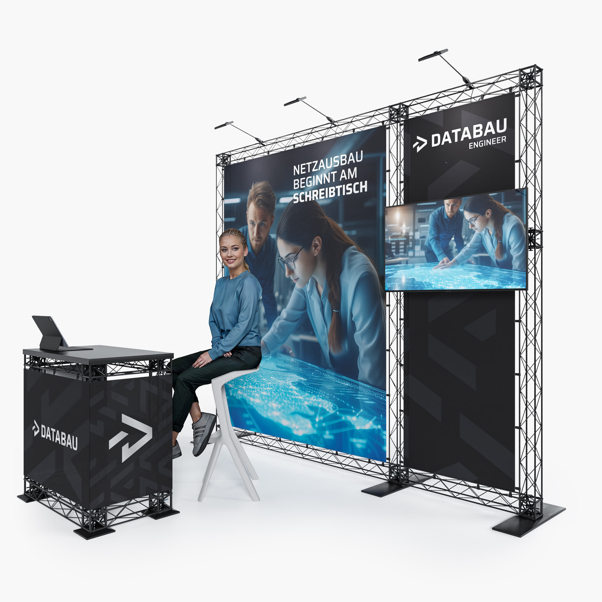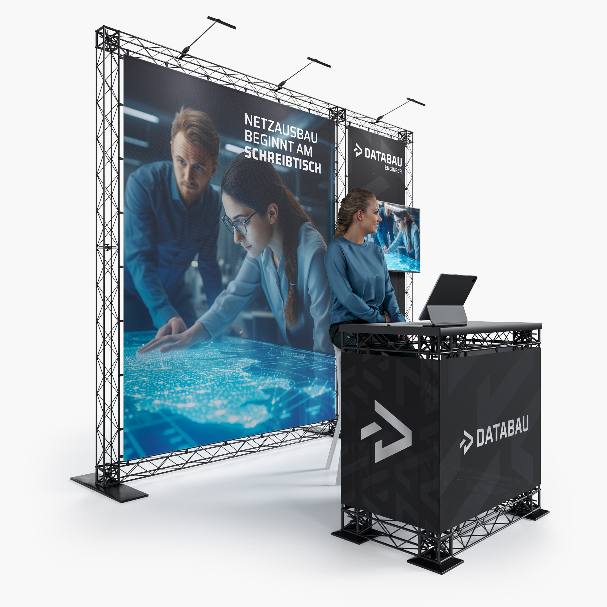Der Messestand besteht aus: Messestand Traverse inklusive 6-Farbdruck auf Display Spezialstoff.