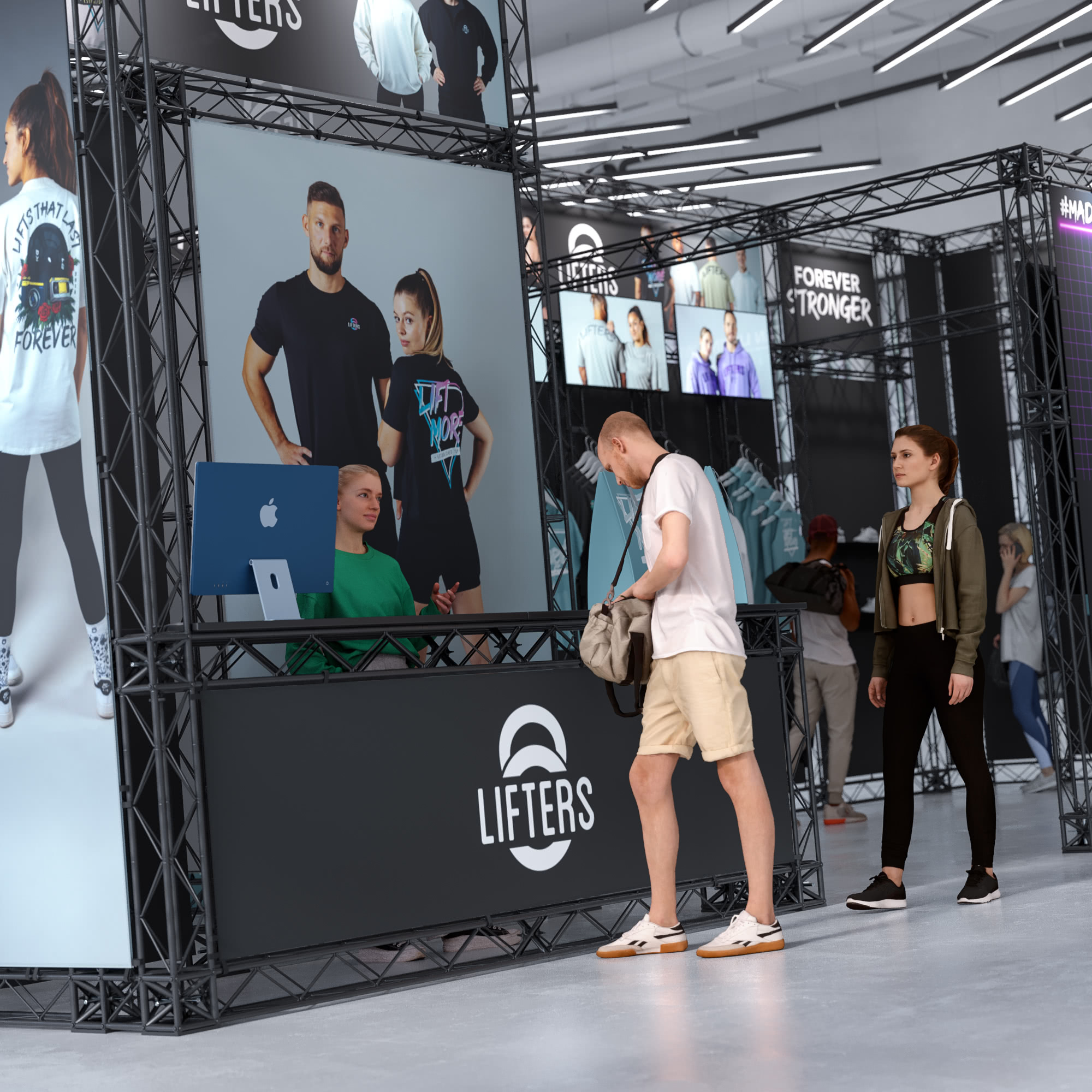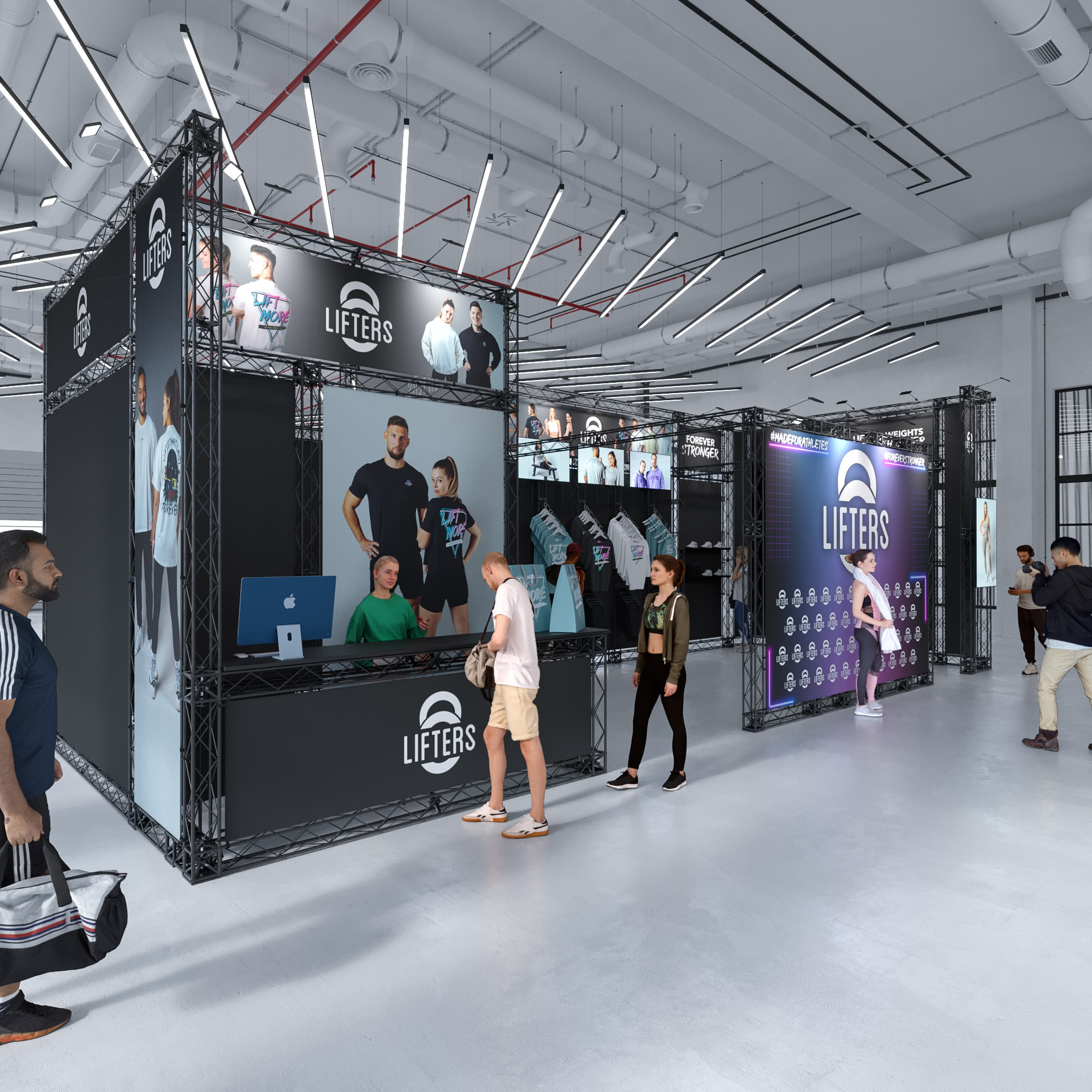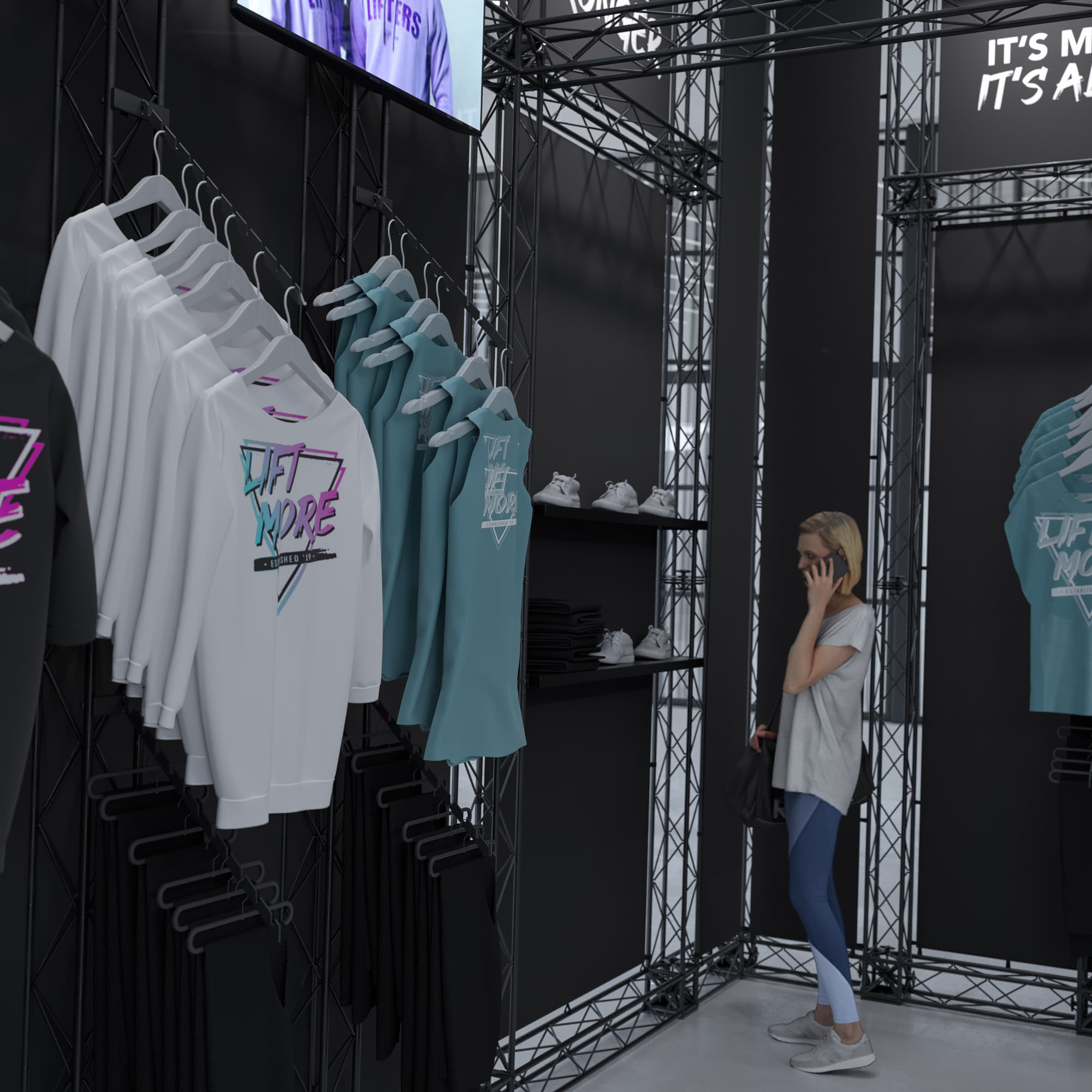 Traversen Messestand (ca. B 1080 cm x H 390 cm x T 405 cm), bestehend aus 1x Traversenrückwand, 2x Traversenseitenwänden mit interierter Kabine, sowie einer Messetheke