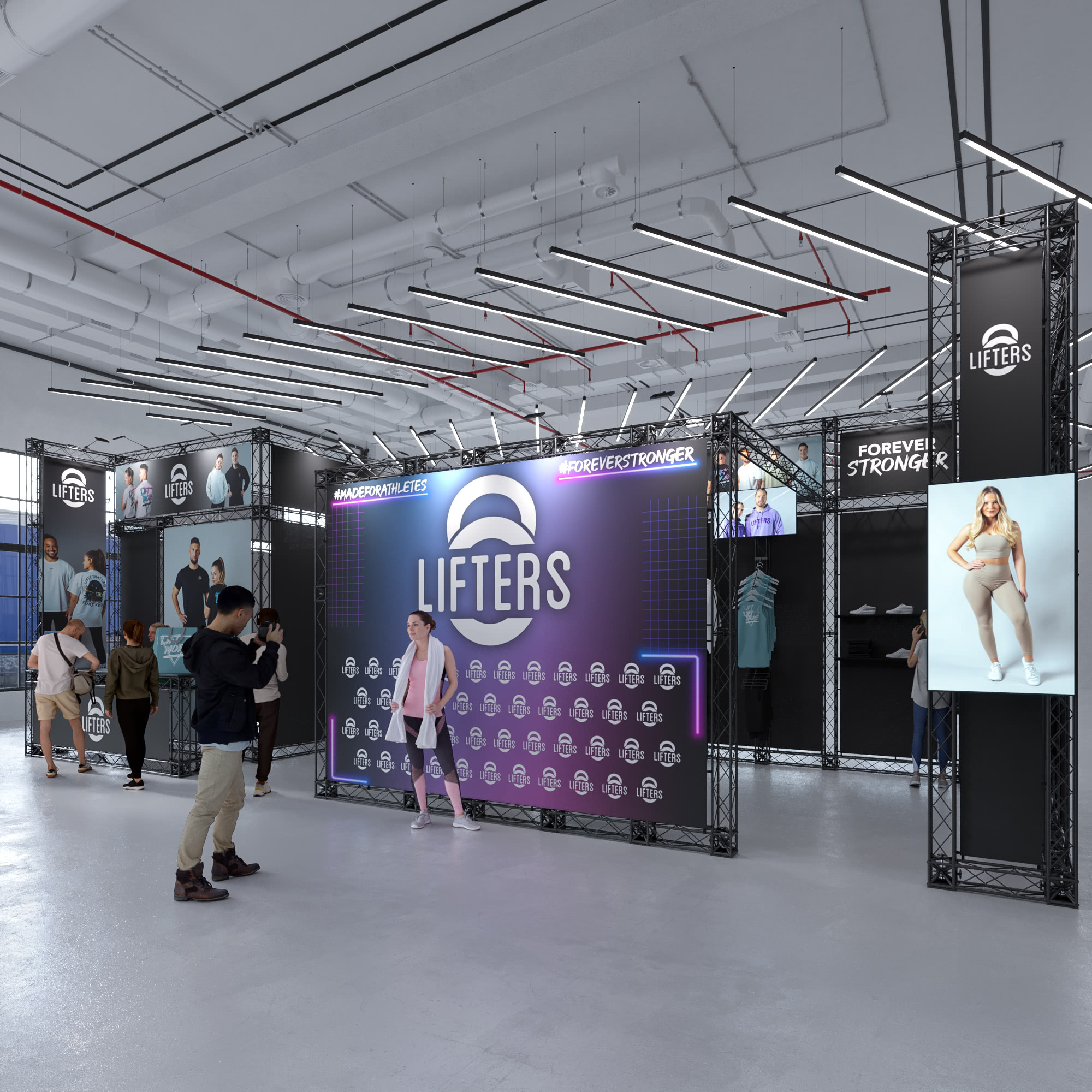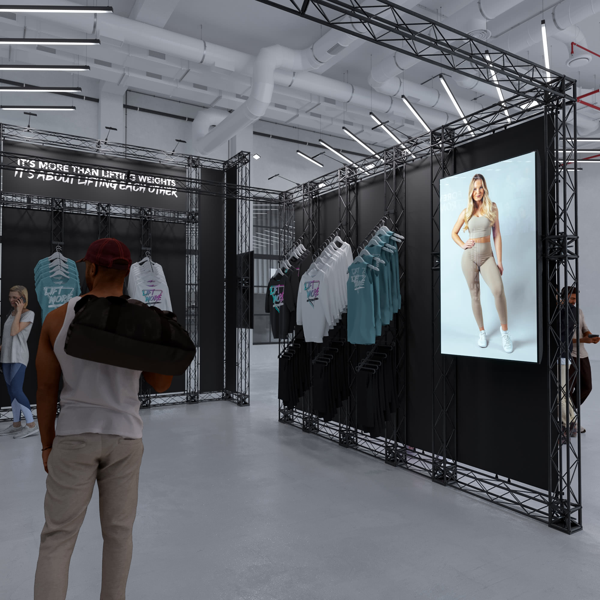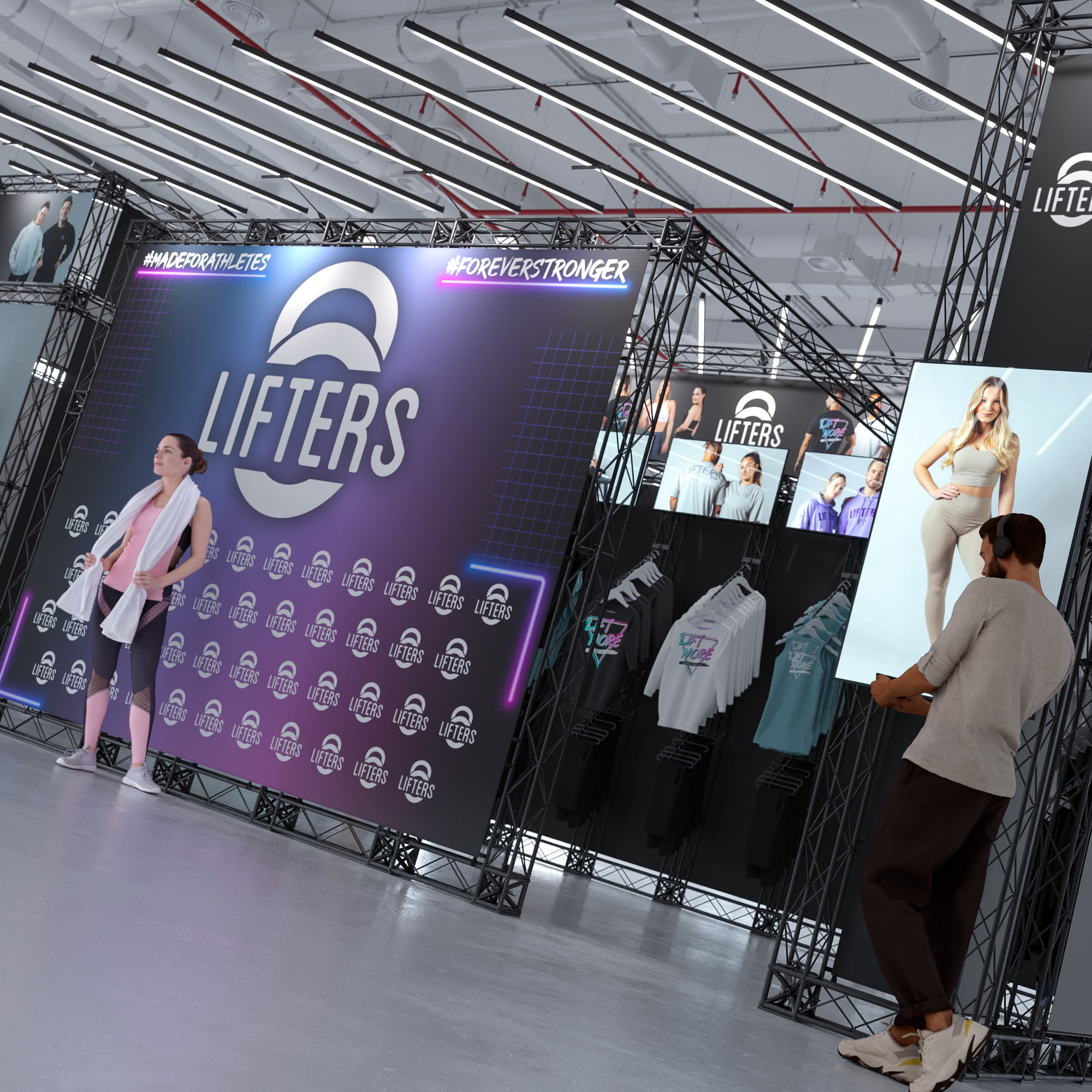 Traversen Messestand (ca. B 1080 cm x H 390 cm x T 405 cm), bestehend aus 1x Traversenrückwand, 2x Traversenseitenwänden mit interierter Kabine, sowie einer Messetheke