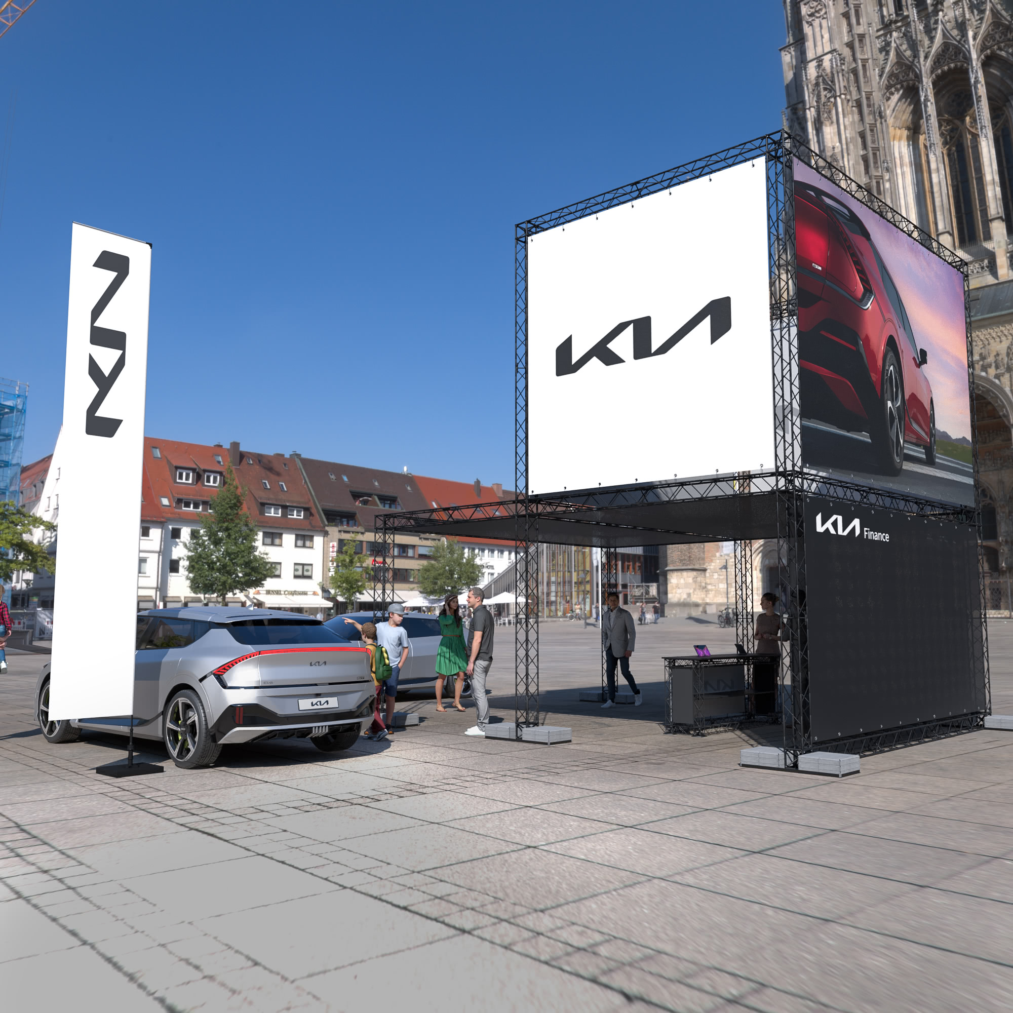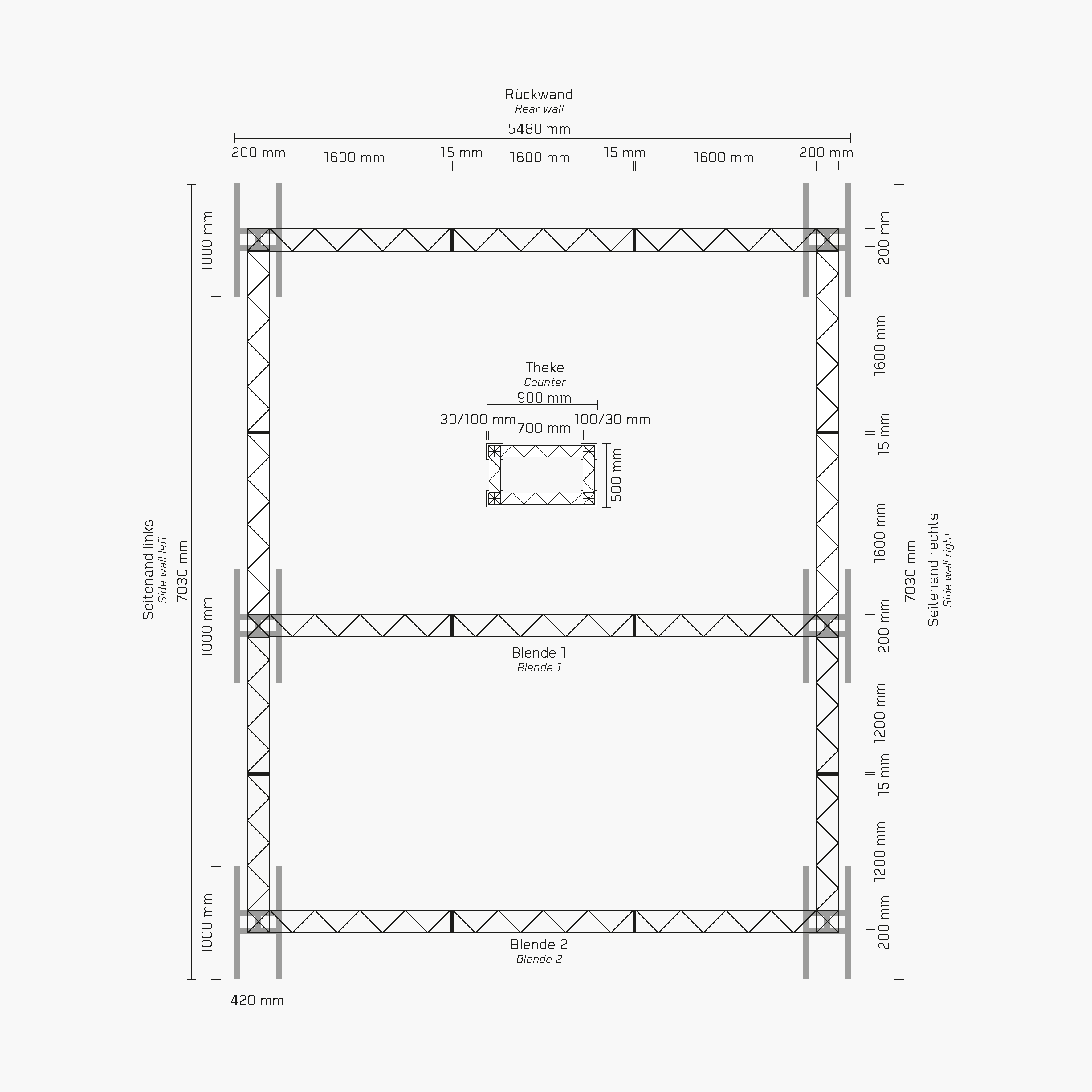 Traversen Outdoor Messestand (ca. B 520 cm x H 620 cm), bestehend aus 1x Traversenrückwand, 1x Traversendach, 1x Traversenwürfel, einer Messetheke und einer Squareflag