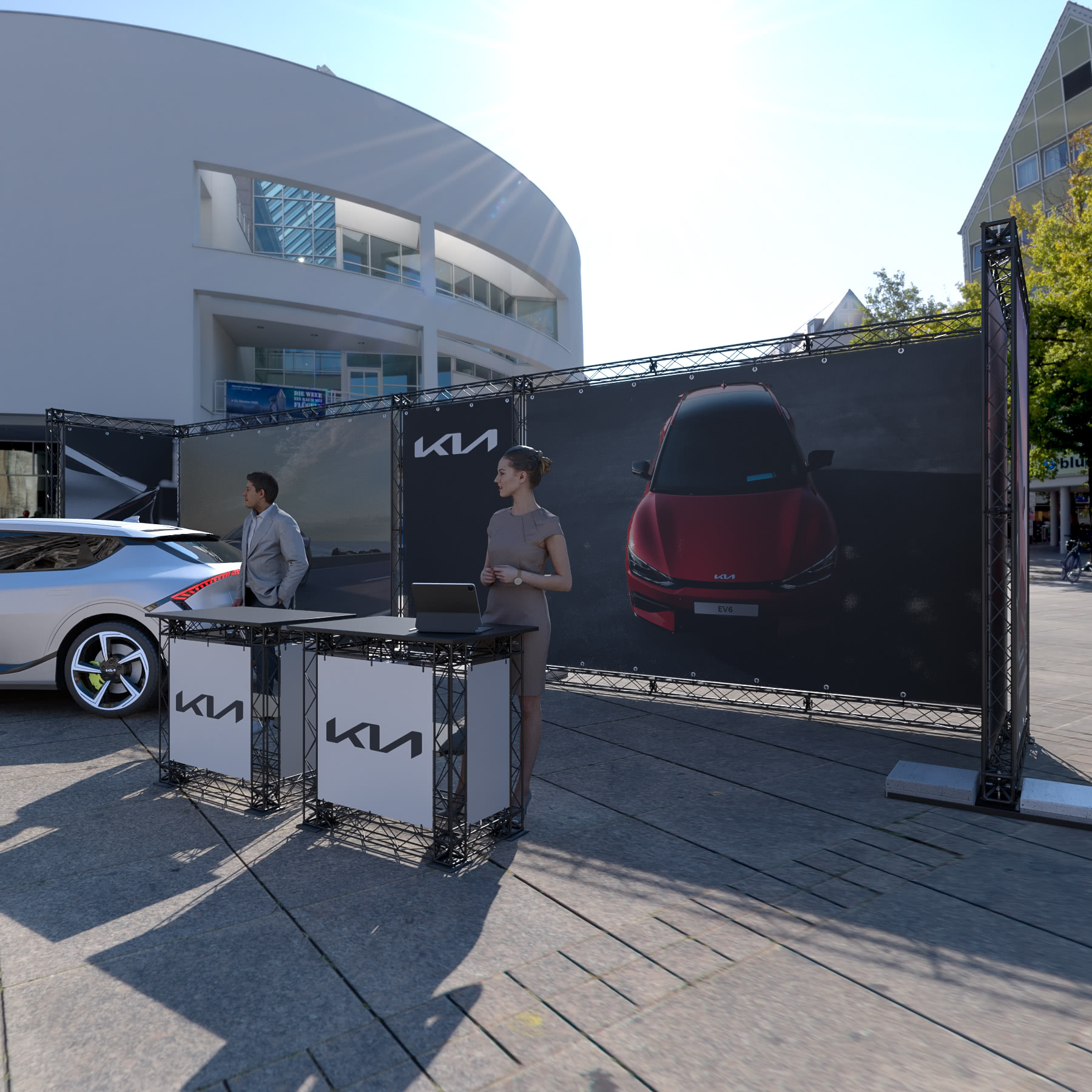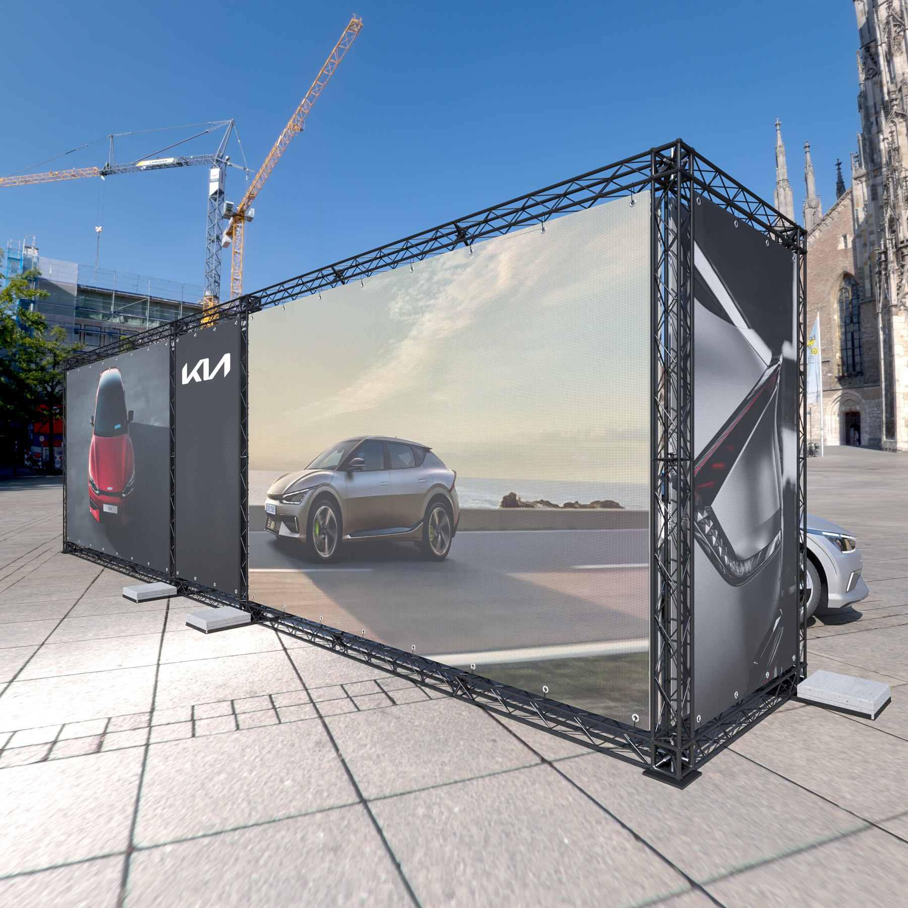 Traversen Outdoor Messestand 2 (ca. B 1020 cm x H 300 cm x T 180 cm), bestehend aus 1x Traversenrückwand, 2x Traversenseitenwänden und 2x Messetheken