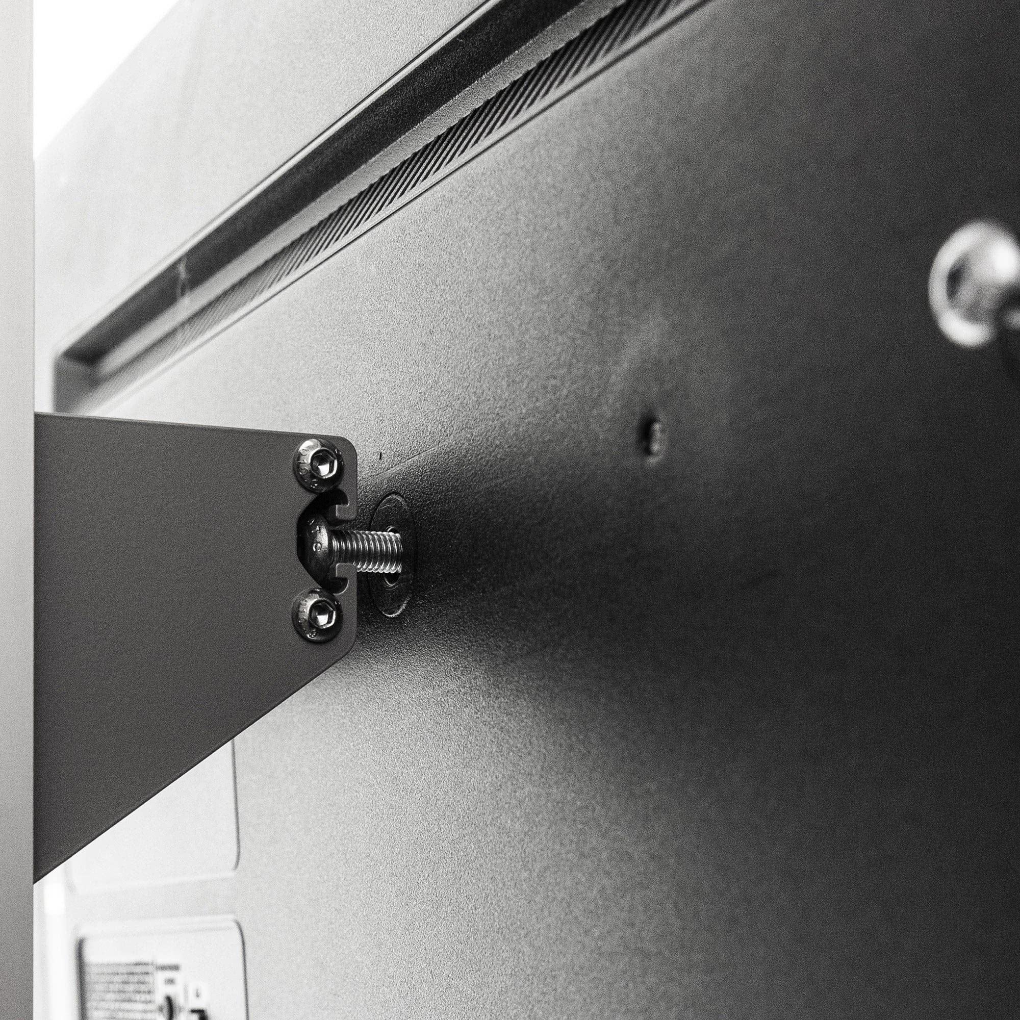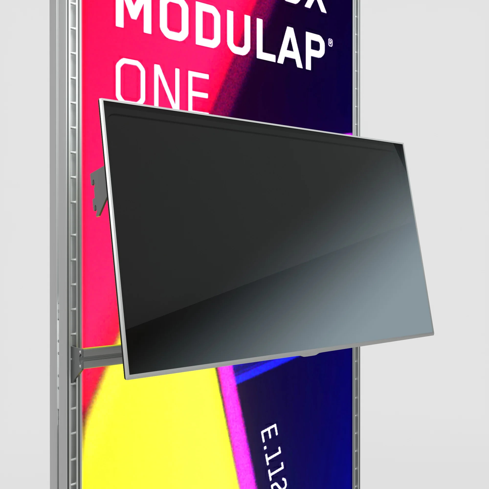 Das funktionale Zubehör für, bestehend aus zwei Multischienen je 82 cm breit, lässt sich ganz einfach mit Messewänden kombinieren. Die Basis für die Anbringung des TV Halters 82 cm sind vertikal montiere Schlitzschienen. An diesen lässt sich frei positionierbar und werkzeugfrei die TV Halterung einhängen.