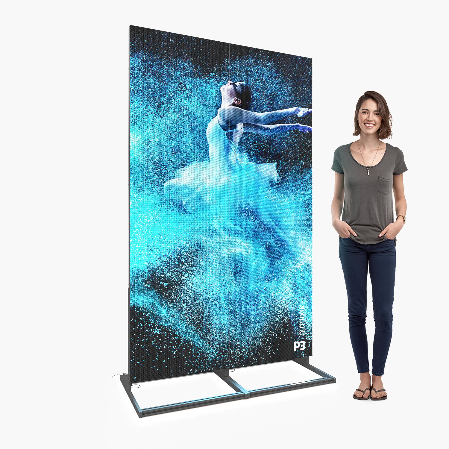 Mit einem Format von ca. B 60 x H 200 cm sind die einzelnen Module einfach und problemlos transportabel – sogar in einem Van! Mit handlichen 45 kg pro Element können die Module von zwei Personen getragen werden. Mit dem 3 mm Pixel-Pitch sehen Sie bereits ab einer Entfernung von 3 Metern gestochen scharfe Bilder. Diese werden einfach per Wlan an die LED Wand übermittelt. Sollten Sie Unterstützung bei der Erstellung des Designs benötigen, stehen Ihnen unsere Motiondesigner gerne zur Verfügung.
