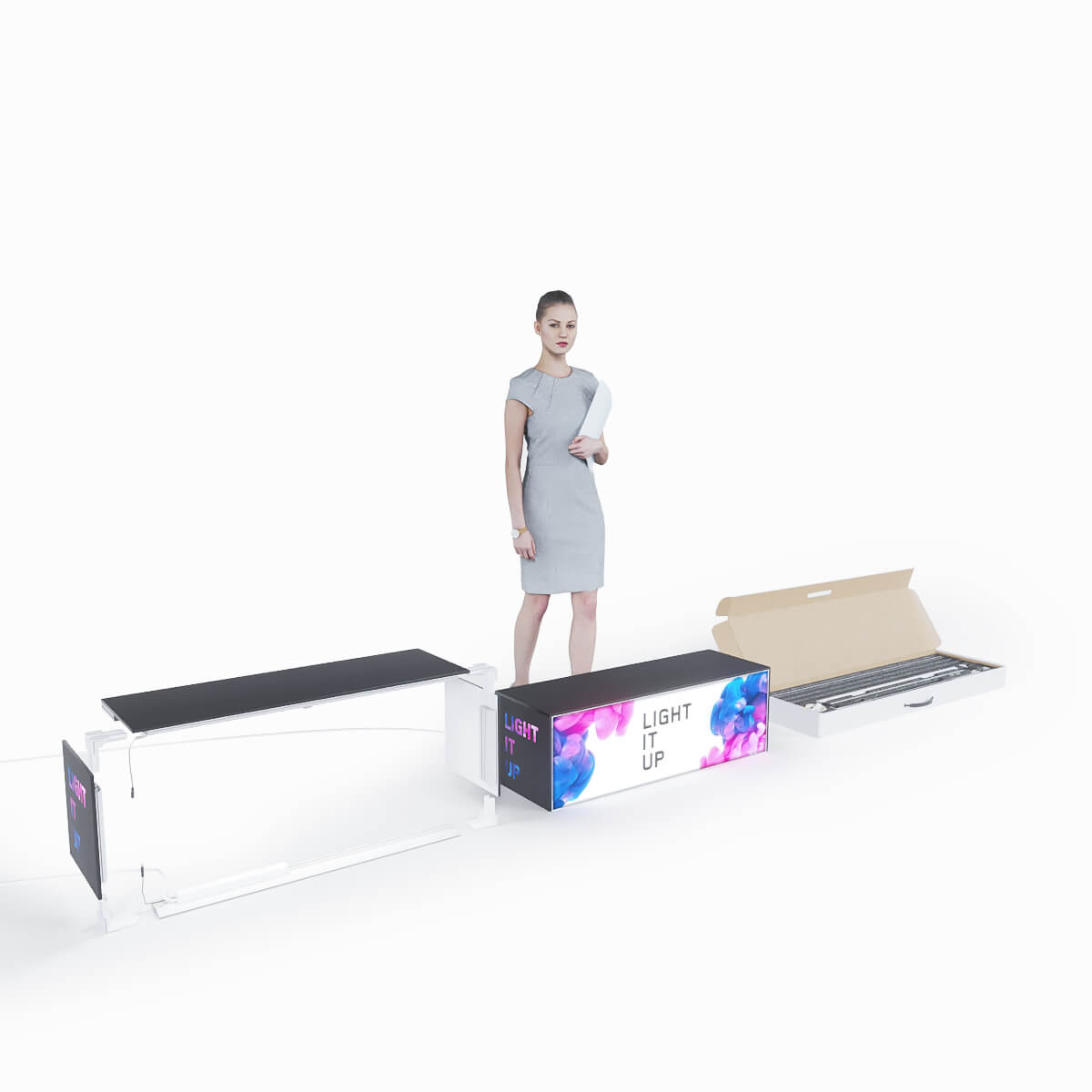 Das Thekensystem besteht aus Aluminiumprofilen mit integrierten LED Modulen, die für eine optimale Stabilität bei einem sehr leichten Gewicht sorgen. Die homogene und sehr helle Ausleuchtung sorgt für höchste Aufmerksamkeit auf Ihrer Messe oder Ihrem Event. Nach Ihrer Veranstaltung können Sie die einzelnen Module der LED Theke einfach wieder auseinanderbauen und in dem optional bestellbaren Transporttrolley verstauen.