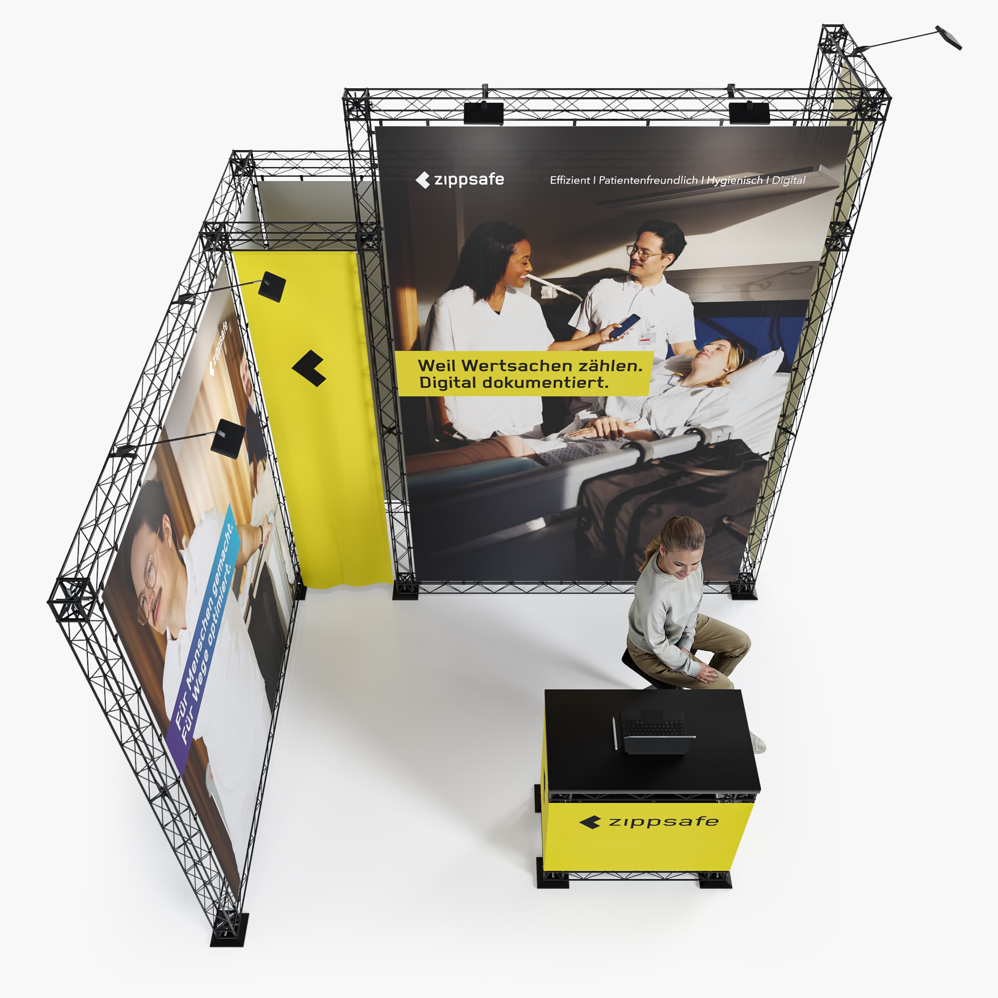Der Messestand besteht aus: Messestand Traverse inklusive 6-Farbdruck auf Display Spezialstoff.