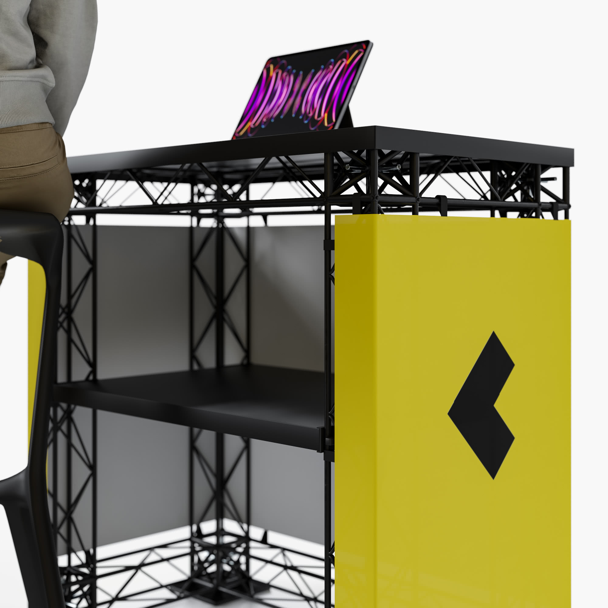 Zu deinem Traversen-Set stehen dir zahlreiche Zubehör-Möglichkeiten zur Verfügung: Neben der enthaltenen Messetheke kannst du LED- oder Halogenstrahler, Monitor- oder Tablet-Halterungen, Ablagen oder auch ein LED-Modul hinzufügen. Oder du entscheidest dich für eine zusätzliche Theke aus Traversen-Elementen!