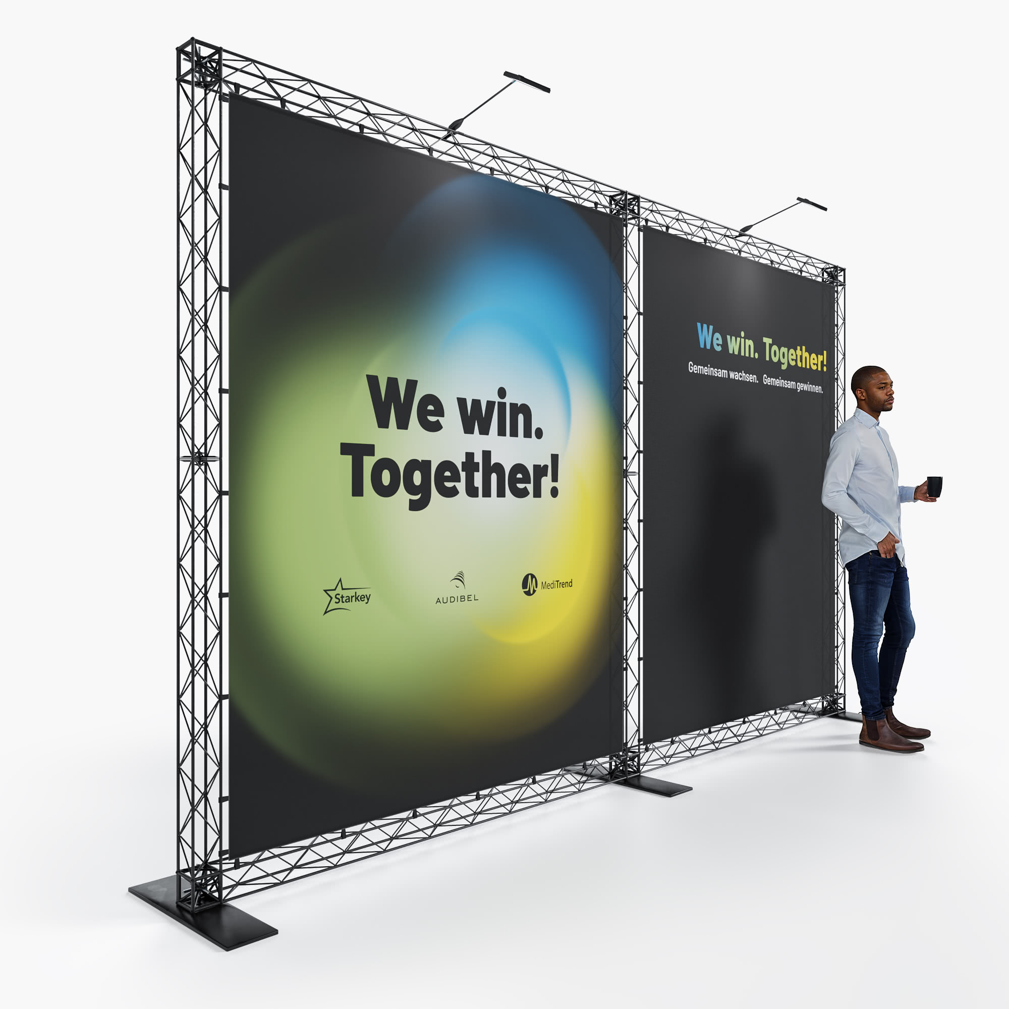 Der farbig bedruckte, textile Displaystoff wird mithilfe eines einfachen Schlaufensystems an der Messewand befestigt – so bleibt dein Motiv immer optimal gespannt.