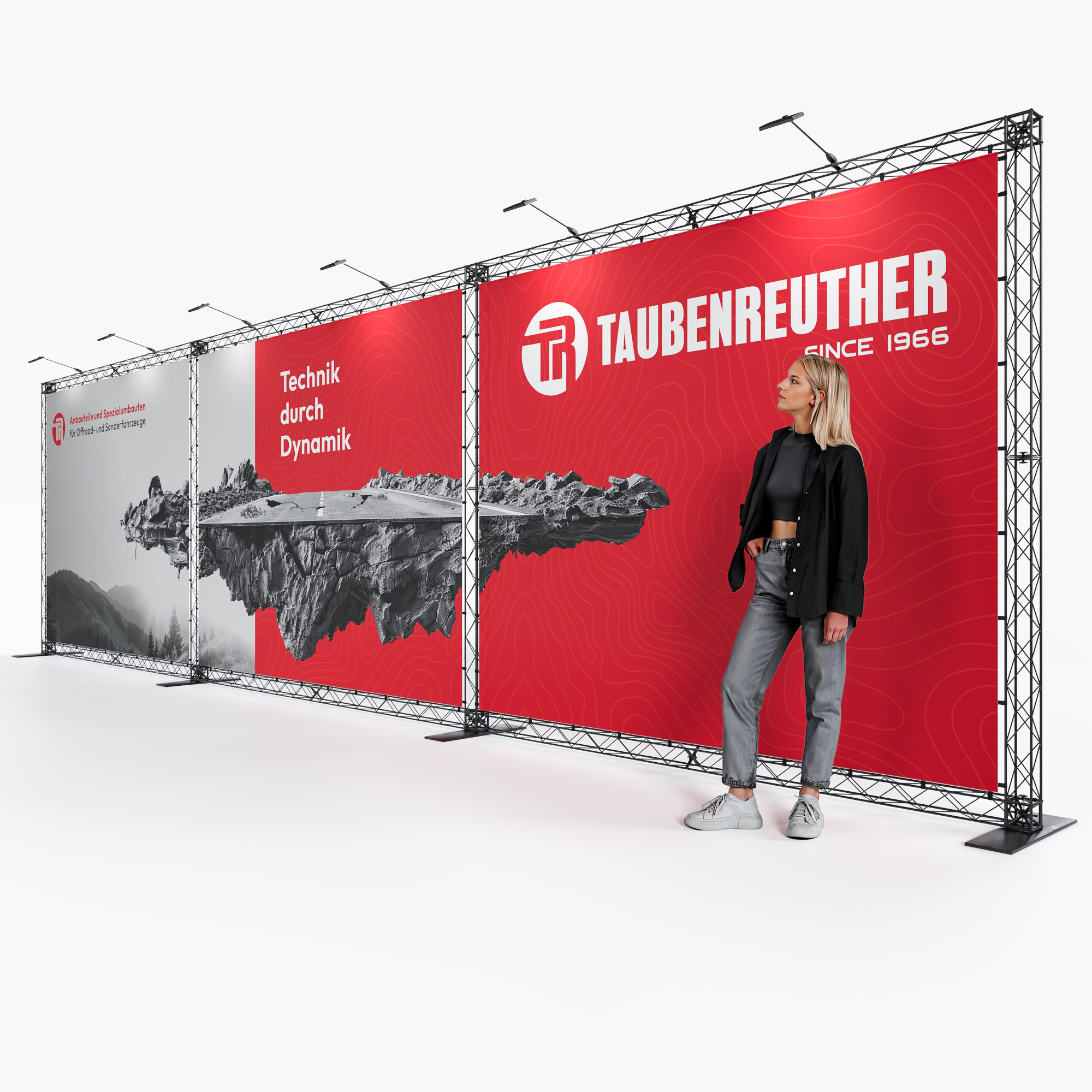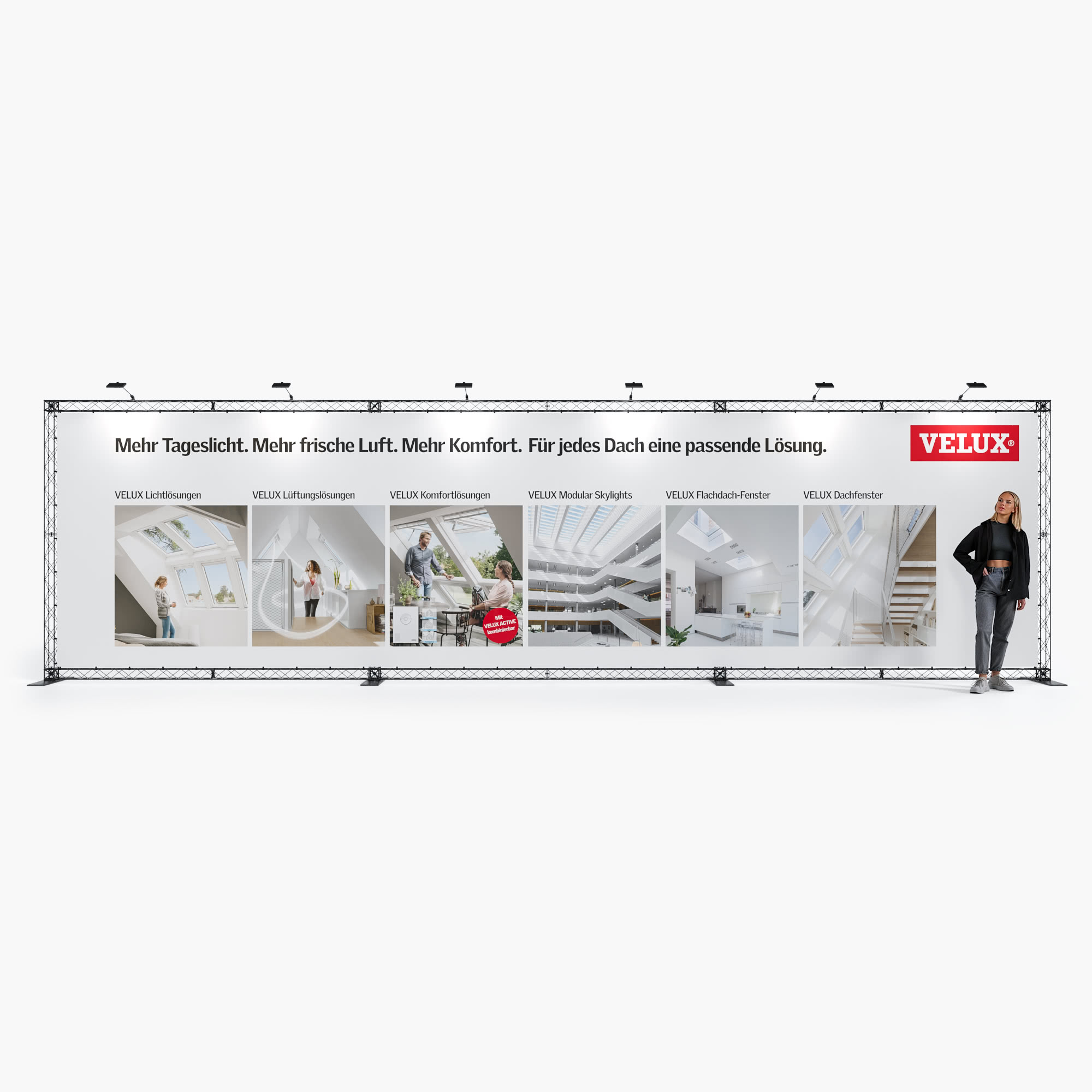 Der farbig bedruckte, textile Displaystoff wird mithilfe eines einfachen Schlaufensystems an der Messewand befestigt – so bleibt dein Motiv immer optimal gespannt.